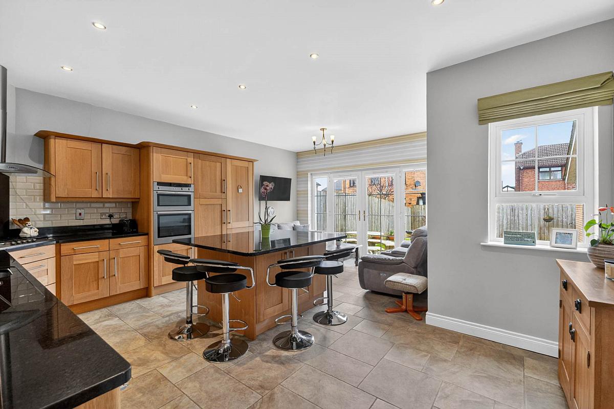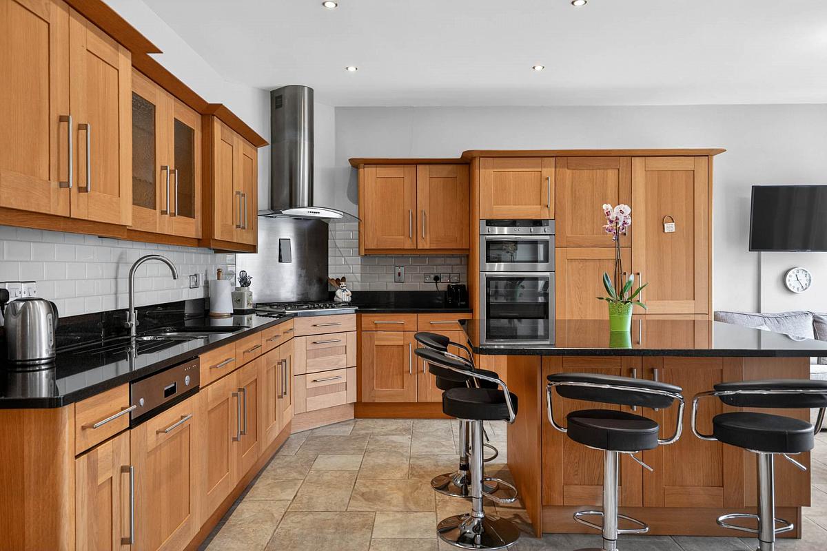 Extensive range of high and low level units in Oak 'shaker'. Built-in double oven, 5 ring gas hob and stainless steel chimney hood over. Large and small stainless steel sink unit with mixer tap. Integrated dishwasher. Island unit with breakfast bar. Integrated fridge. Downlighters. Tiled floor. Part tiled walls. Granite worktops and upstands.