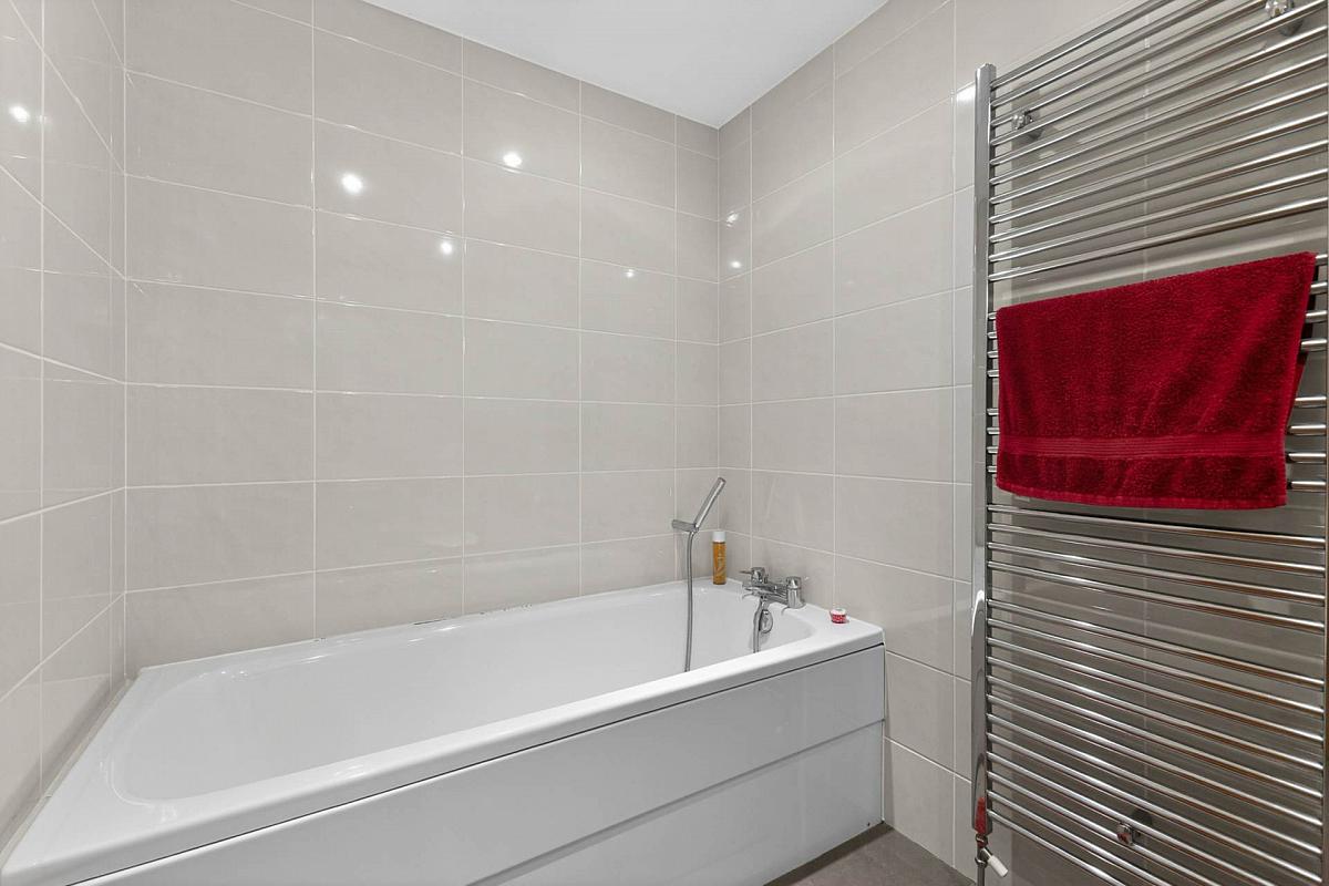 White suite to include bath; wash hand basin with mixer tap; and low flush w.c. Heated towel rail. Downlighters.