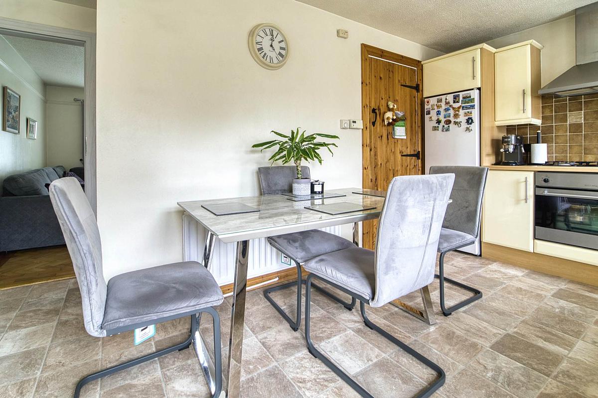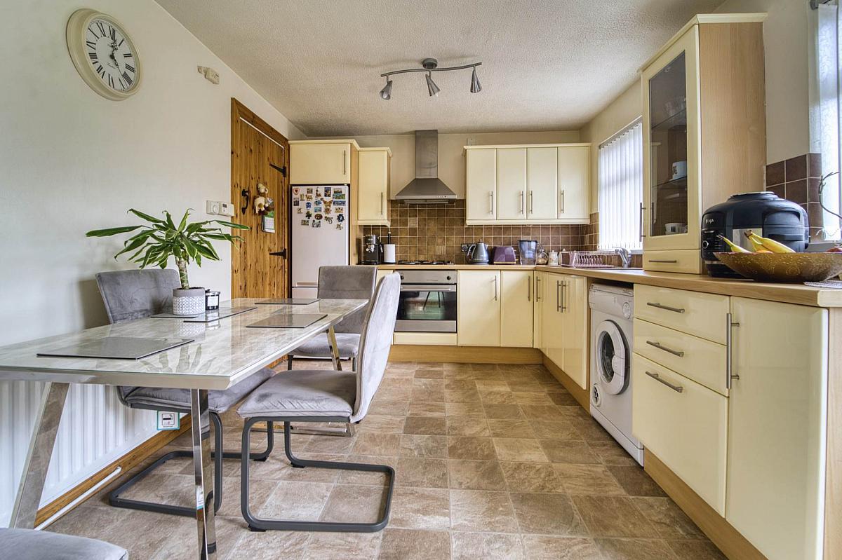 Range of high and low level cupboards in gloss finish. Built-in oven, 4 ring gas hob and extractor fan in stainless steel. Plumbed for washing machine. Part tiled walls. Understairs storage/cloaks cupboard with gas boiler. uPVC double glazed rear door.
