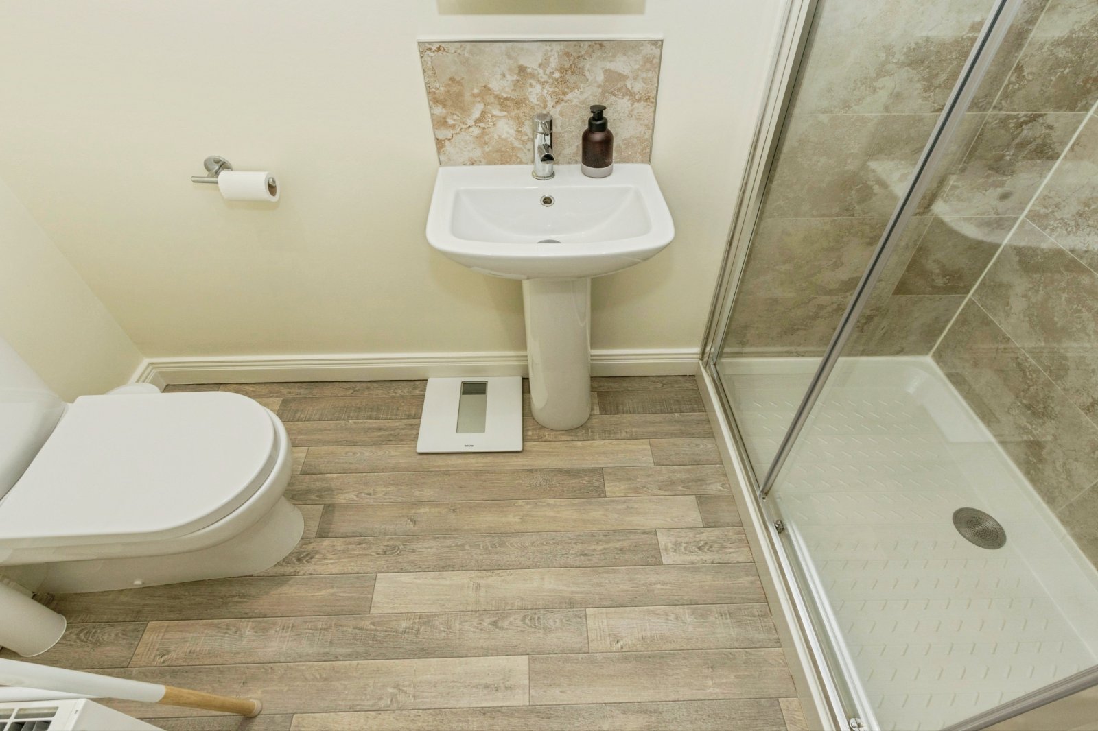 Separate shower cubicle with controlled shower, wash hand basin, low level WC, wall tiling.