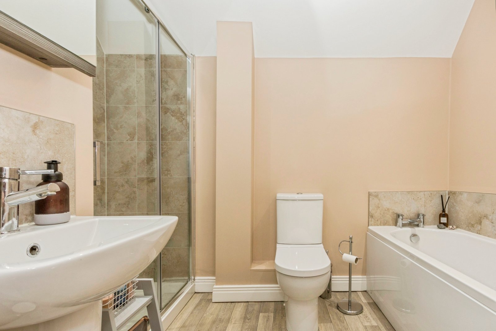 White suite comprising panelled bath, wash hand basin, low level WC, separate shower cubicle, wall tiling.