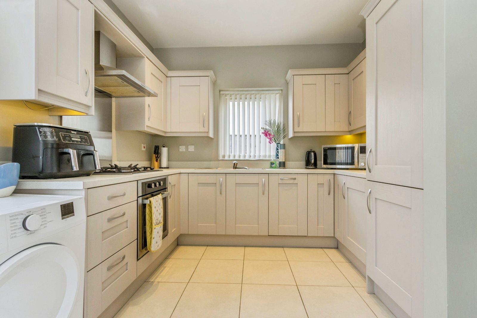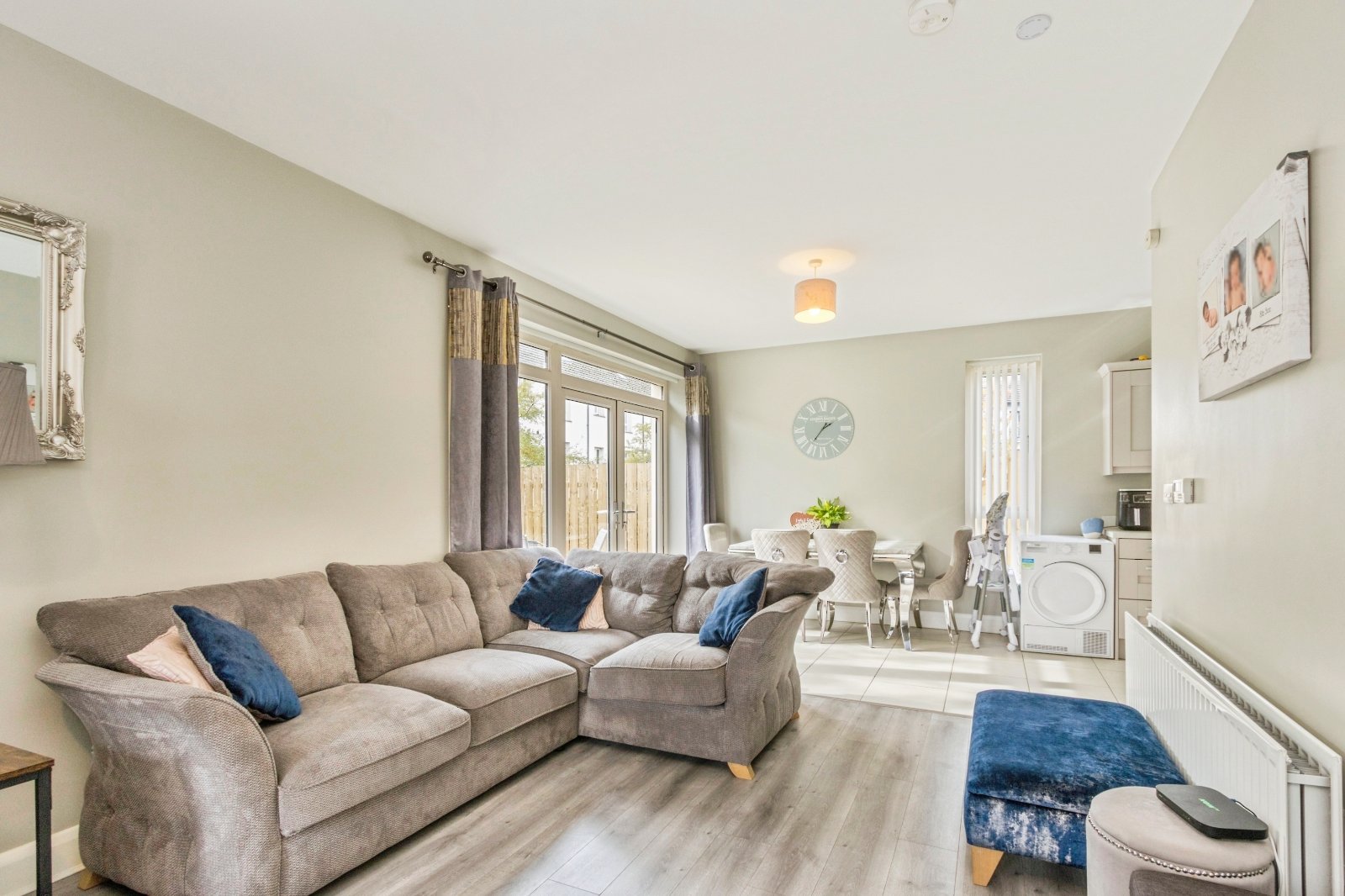 Laminate flooring, French doors to rear/ side gardens. Modern fitted range of high and low level units, laminate work tops, single drainer stainless teel sink unit, built-in gas hob and electric oven, over head extractor fan, integrated fridge freezer and dishwasher, plumbed for washing machine, tiled flooring.