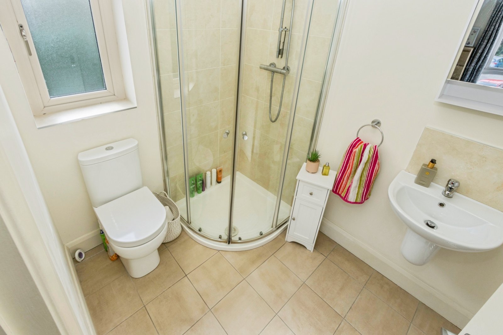 Separate shower cubicle with controlled shower, wash hand basin, low level WC, wall and floor tiling.