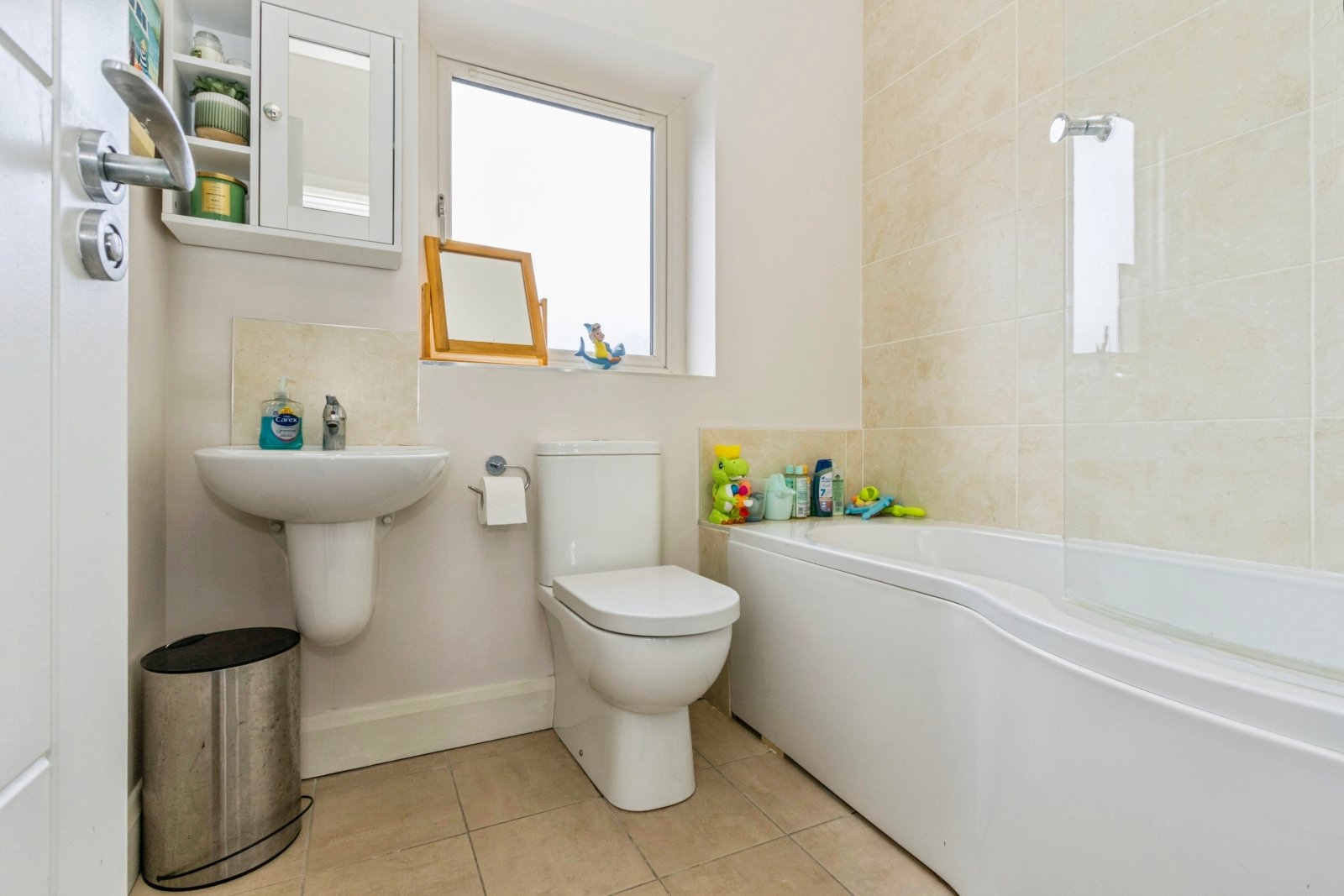 White suite comprising panelled bath, wash hand basin, low level WC, wall and floor tiling.