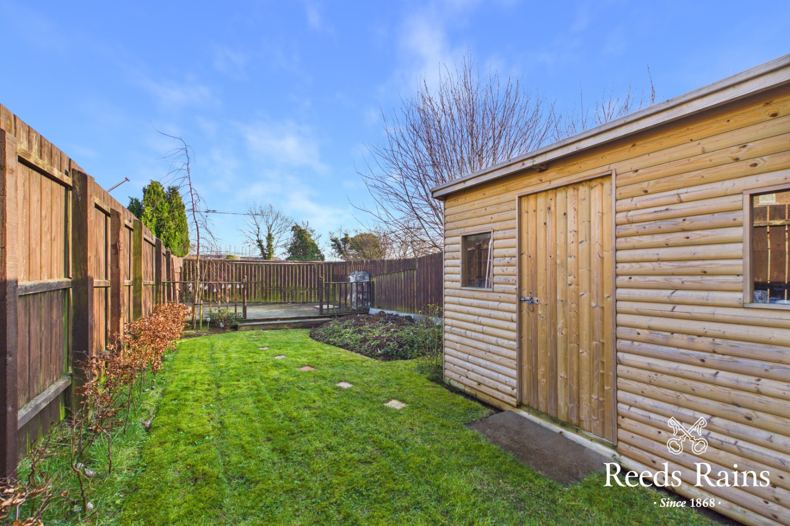 Neat lawns, paved patio with further decking area.