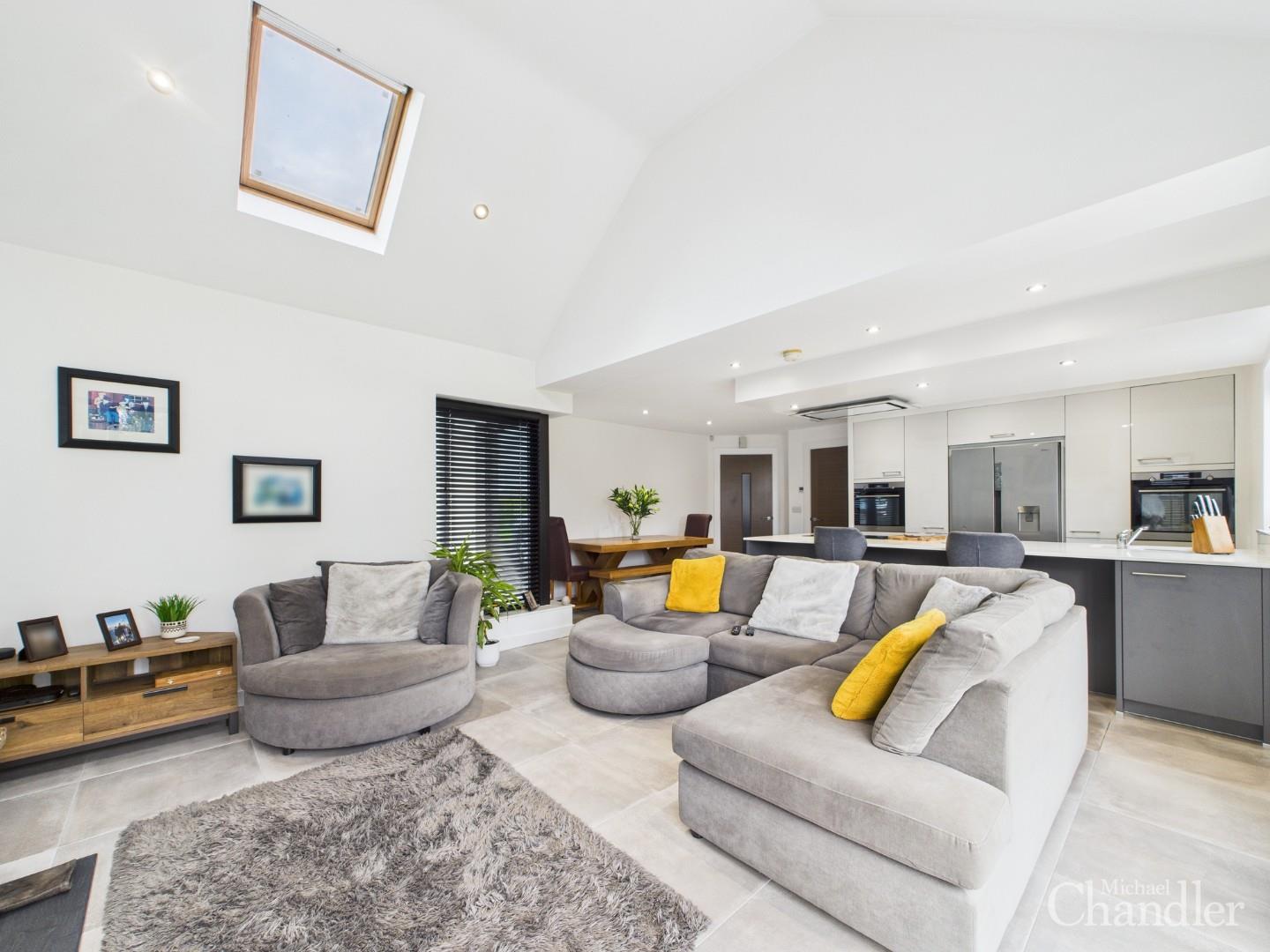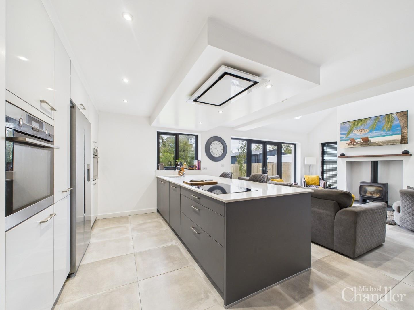 A bright and spacious entrance hall welcomes you into the home, complete with convenient under-stair storage. At the heart of the home lies the impressive open-plan kitchen, dining and living area - a stunning space boasting high ceilings, a wood-burning stove, and double doors opening out to the rear garden, perfect for both everyday living and entertaining. The modern kitchen is complemented by a large utility room and a downstairs WC, offering both practicality and style. A second reception room provides a versatile space currently set up as a dining/living area, while the fourth bedroom on the ground floor adds flexibility for guests, a home office, or a playroom.