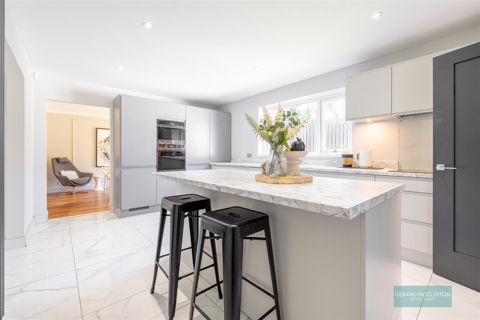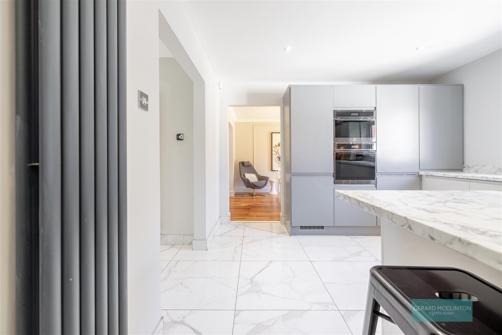 Range of high and low level contemporary, soft close, grey units with contrasting marble effect worktops and up stands. 1 1/2 bowl ceramic sink unit with drainer and mixer taps. Eye level built in double oven. Built in 4 ring hob with splash back and concealed extractor over. Integrated fridge and freezer. Integrated dishwasher. Feature grey vertical radiator. Recessed spotlights. Large marble style porcelain tiles. Marble effect large porcelain tiled floor. Central island with under storage, breakfast seating area, spotlights, Upvc double glazed window to rear, door to utility