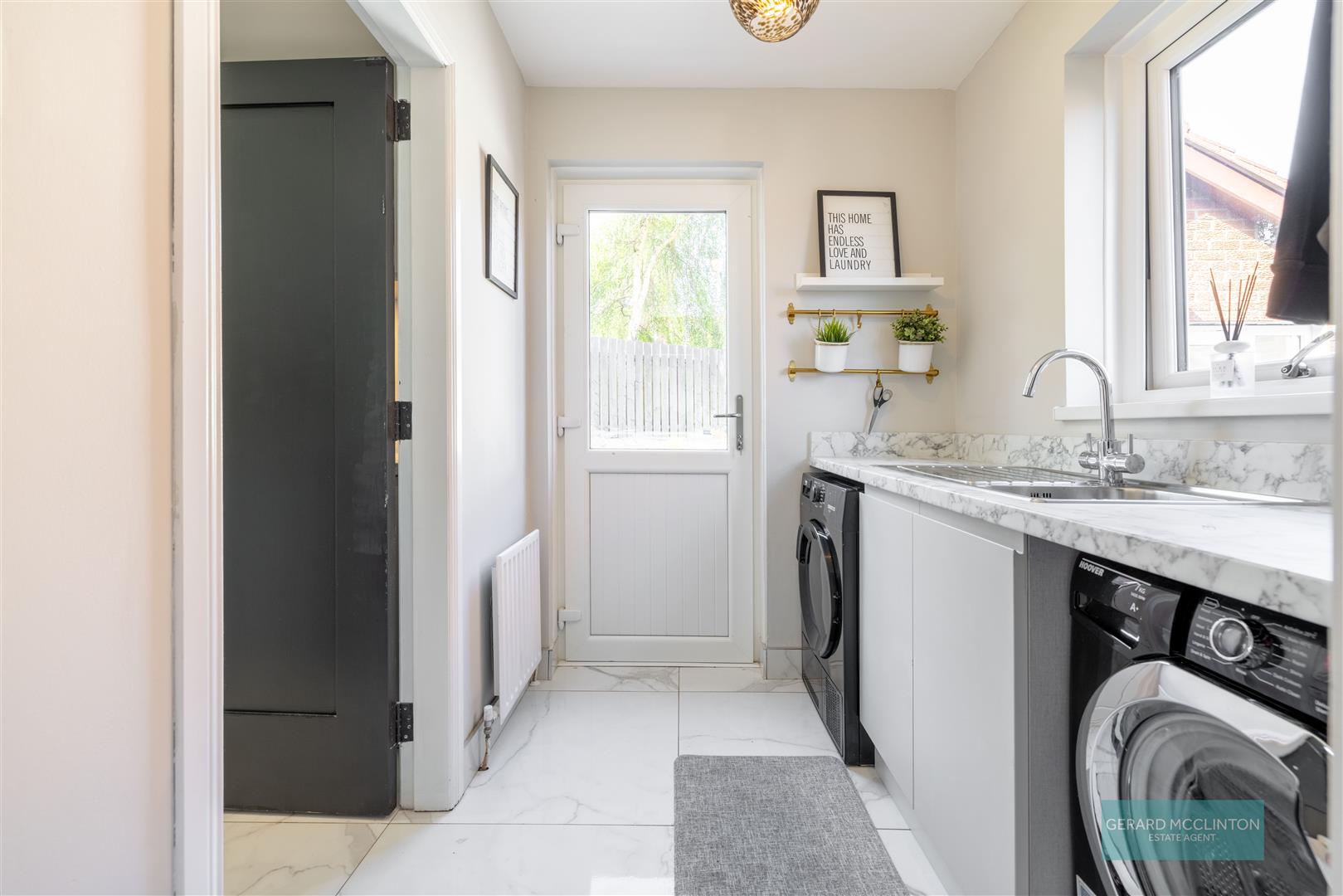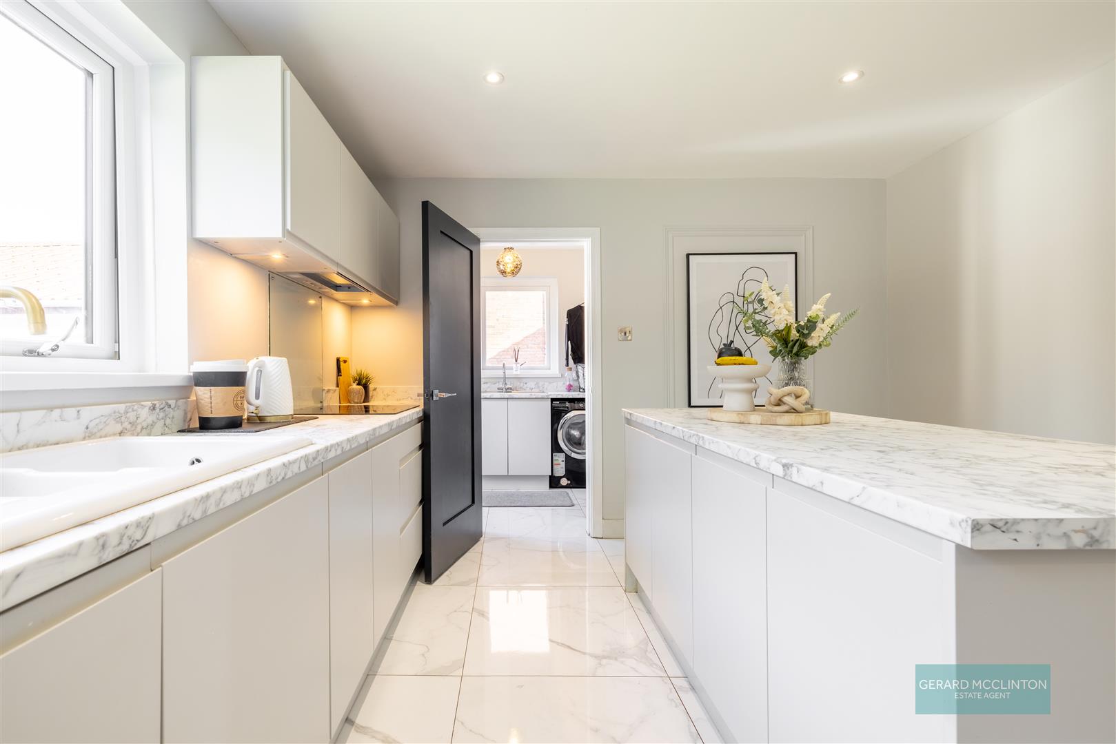 Range of modern, low level light grey units with contrasting marble effect worktop. stainless steel sink unit with mixer tap and drainer. Plumbed and space for washing machine & tumble dryer. Upvc double glazed window to side and door to rear garden rear door. Marble effect large porcelain tiled floor. Door to cloak room