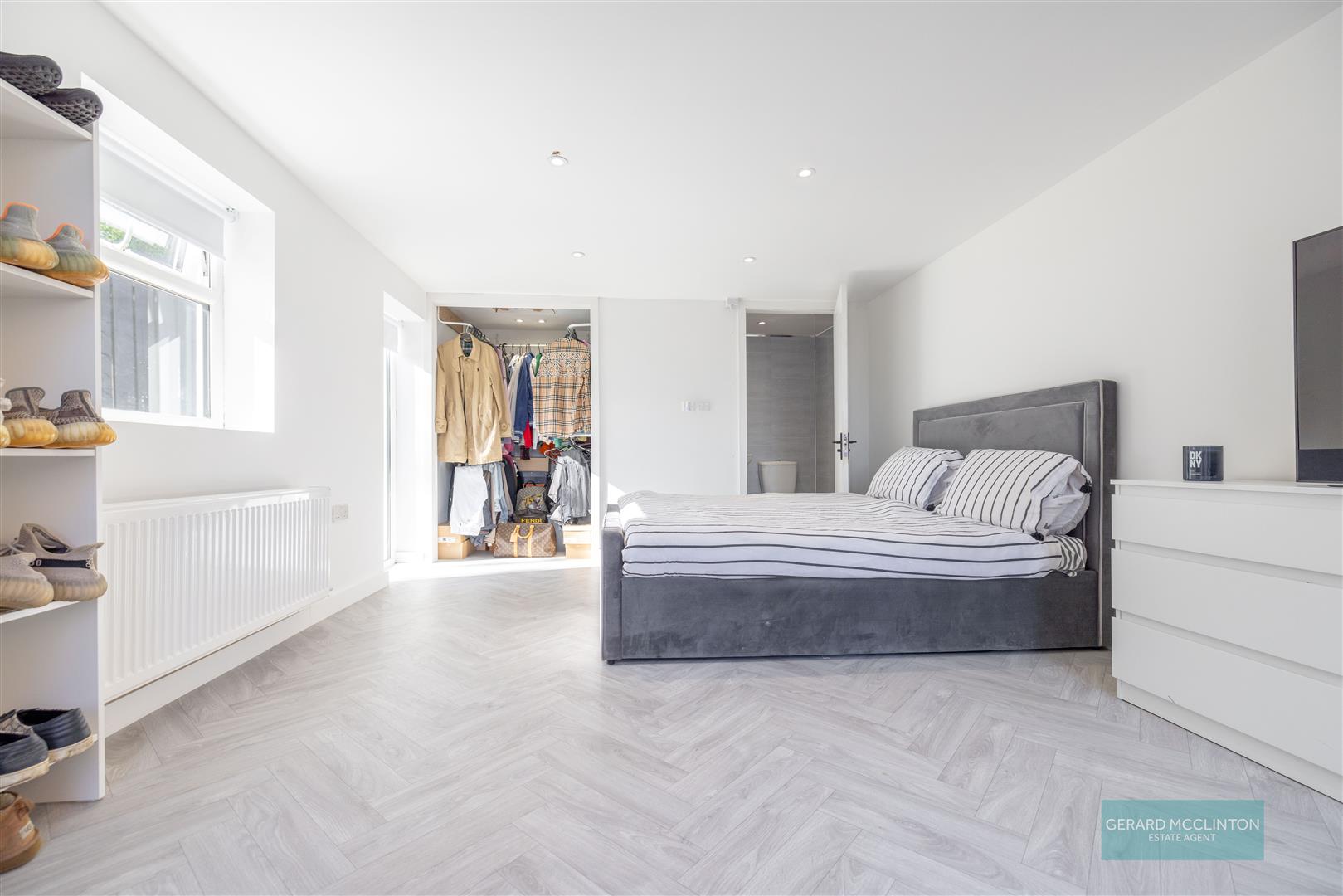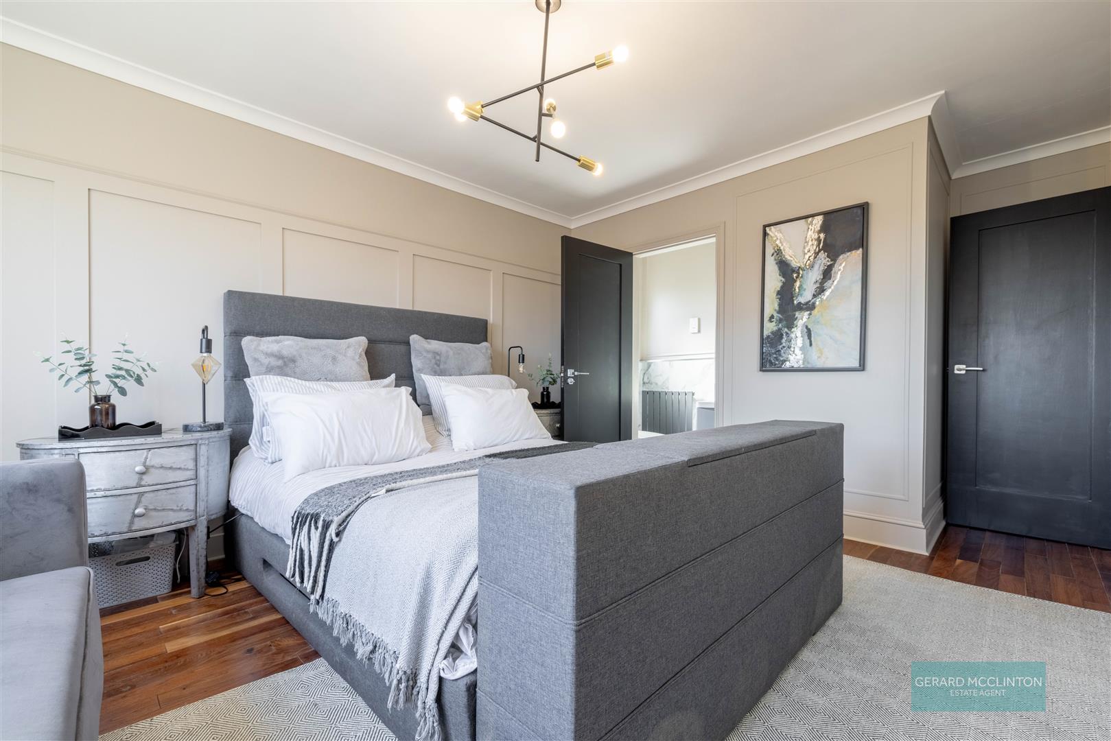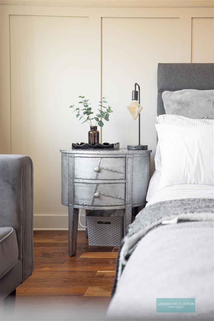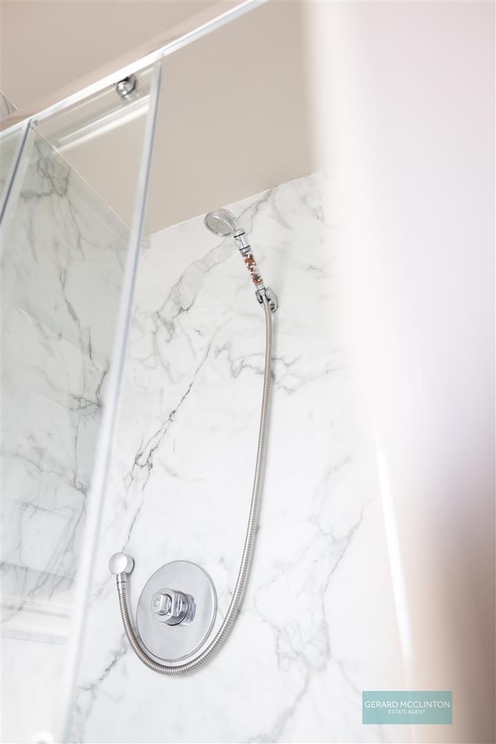 Built in hotpress. Access to roof space. Feature grey vertical radiator. Moulded architraves. Recessed spotlights.
