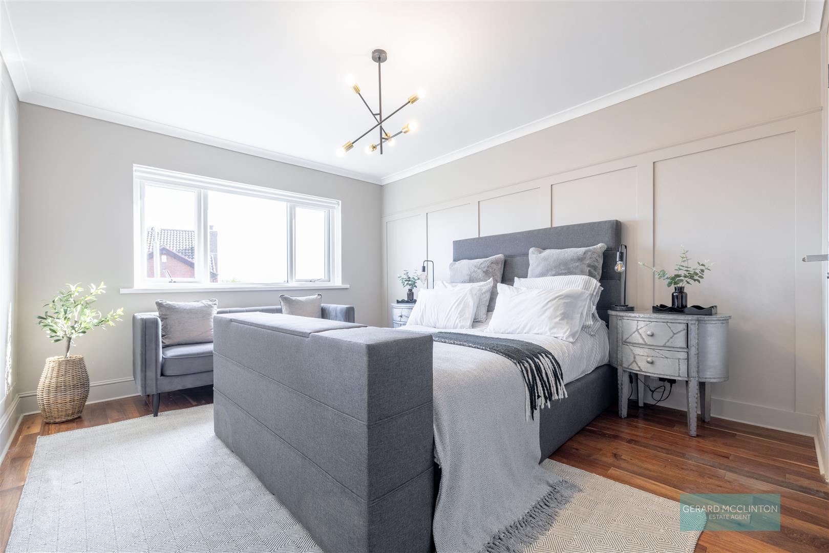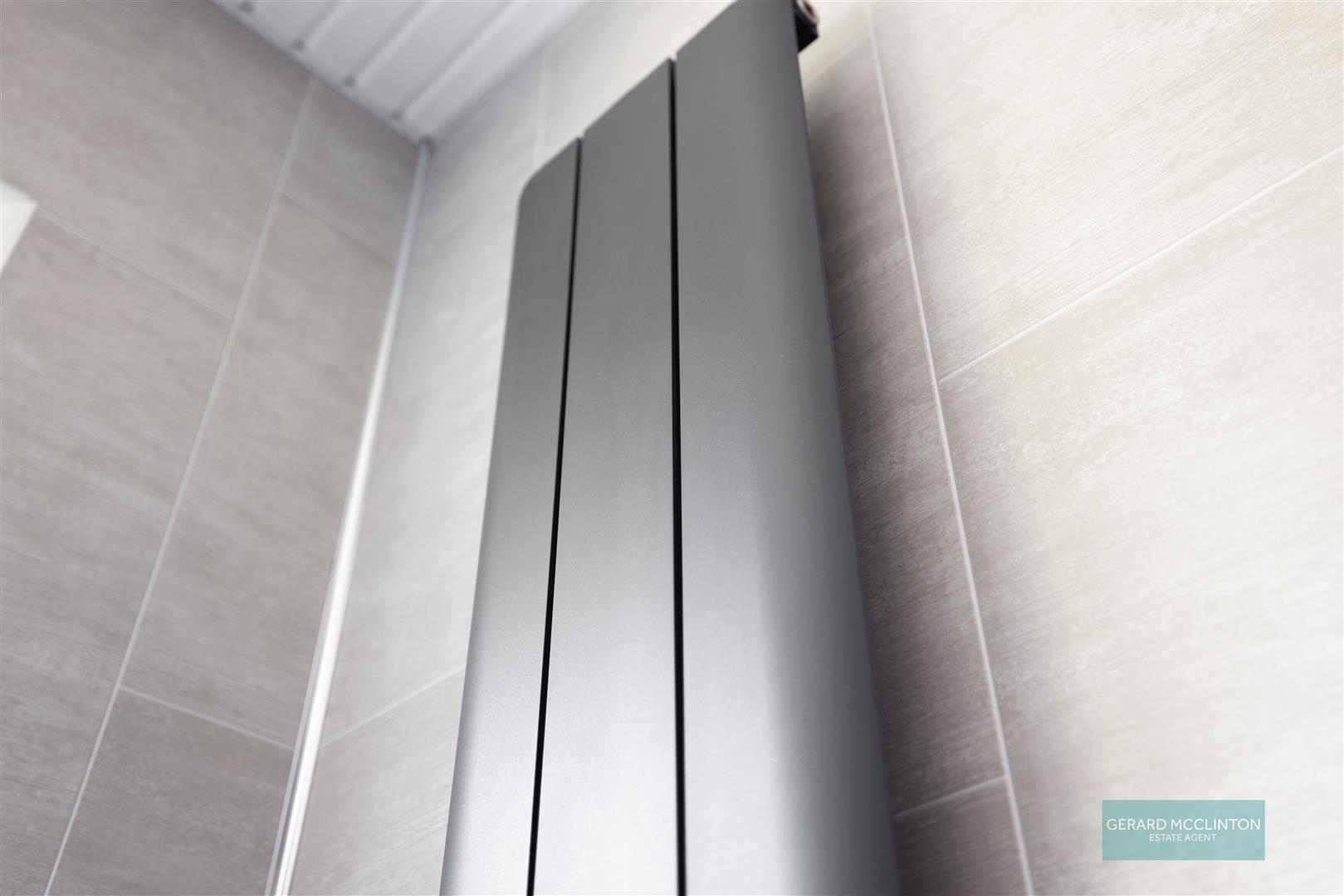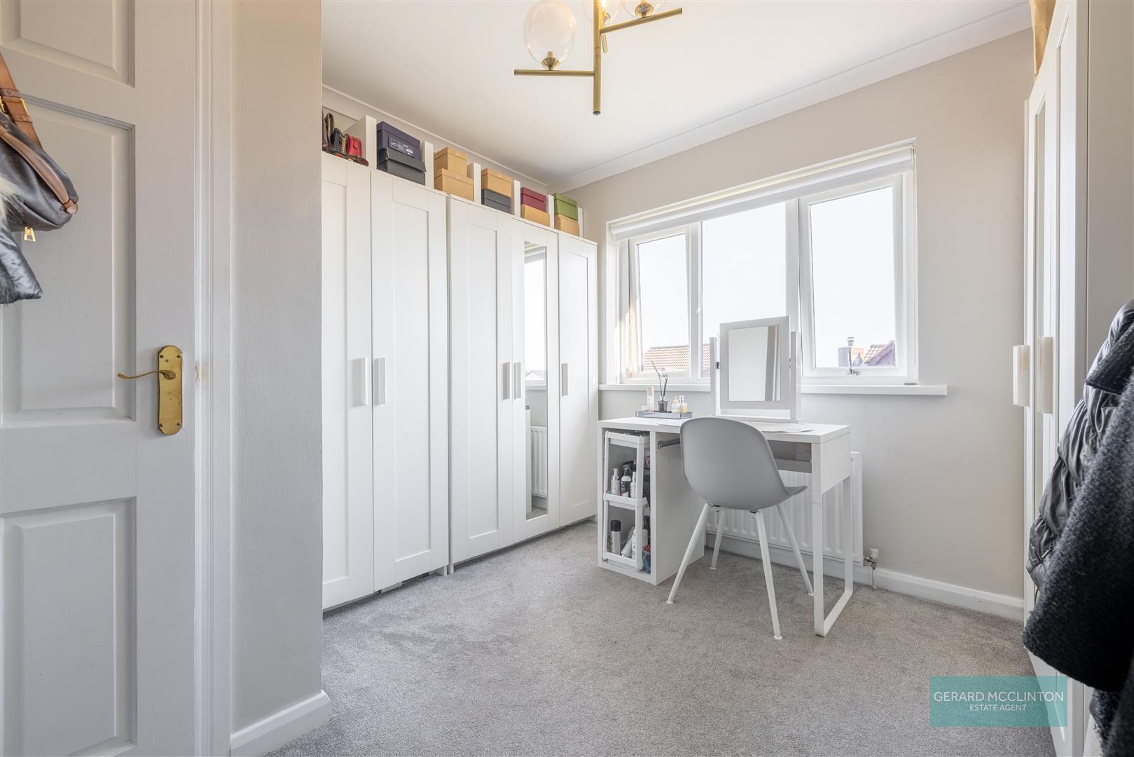Built in hotpress. Access to roof space. Feature grey vertical radiator. Moulded architraves. Recessed spotlights.