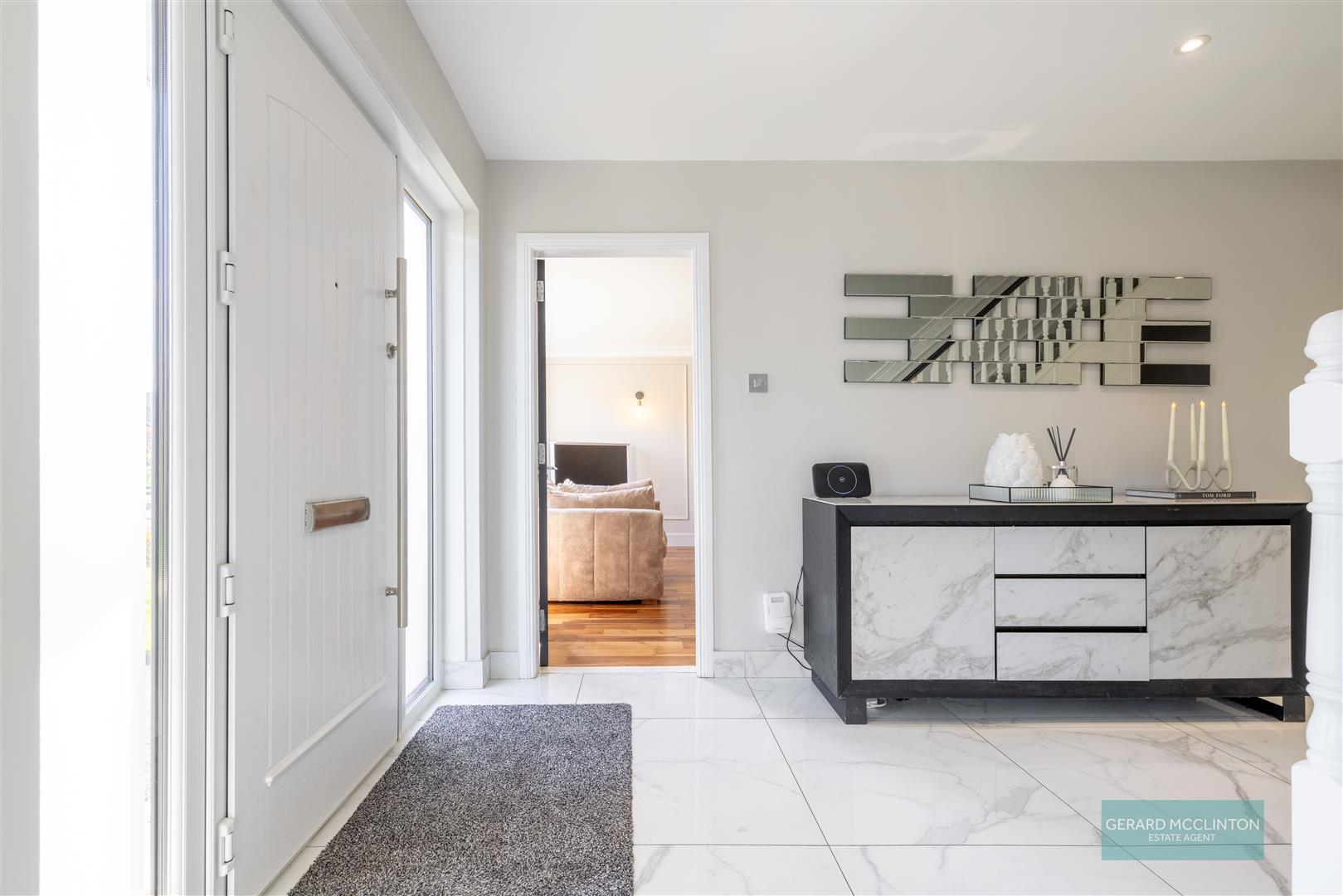 Composite double glazed front door and matching side panels. Large marble style porcelain tiled floor. Built in storage under stairs. Recessed spotlights, feature grey vertical radiator wall panelling,
