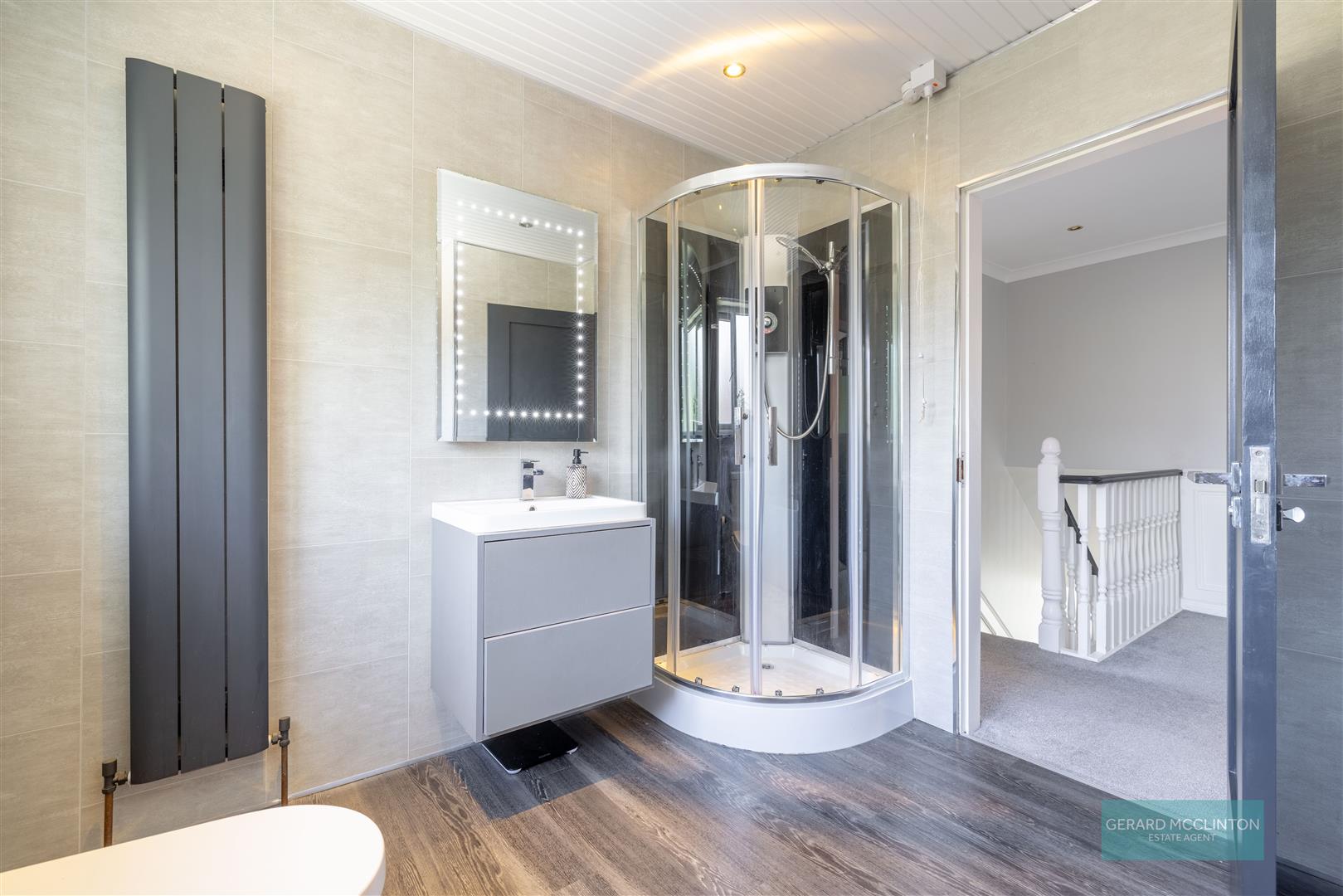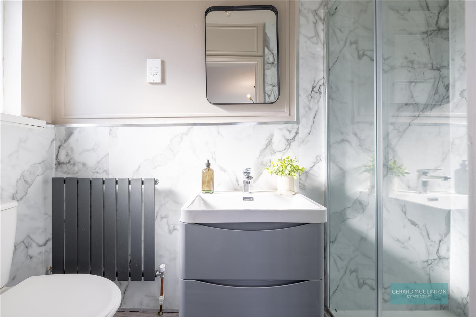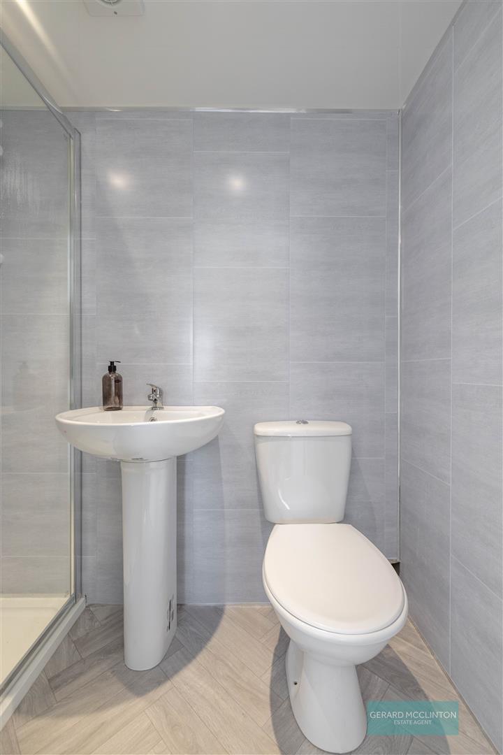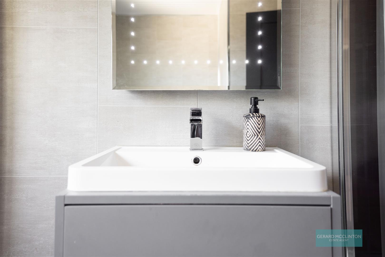 Low flush WC. Floating vanity unit with mixer tap. Fully tiled shower cubicle with main fittings. Half tiled walls. Shaver point. Tiled floor.feature grey radiator, upvc double glazed window