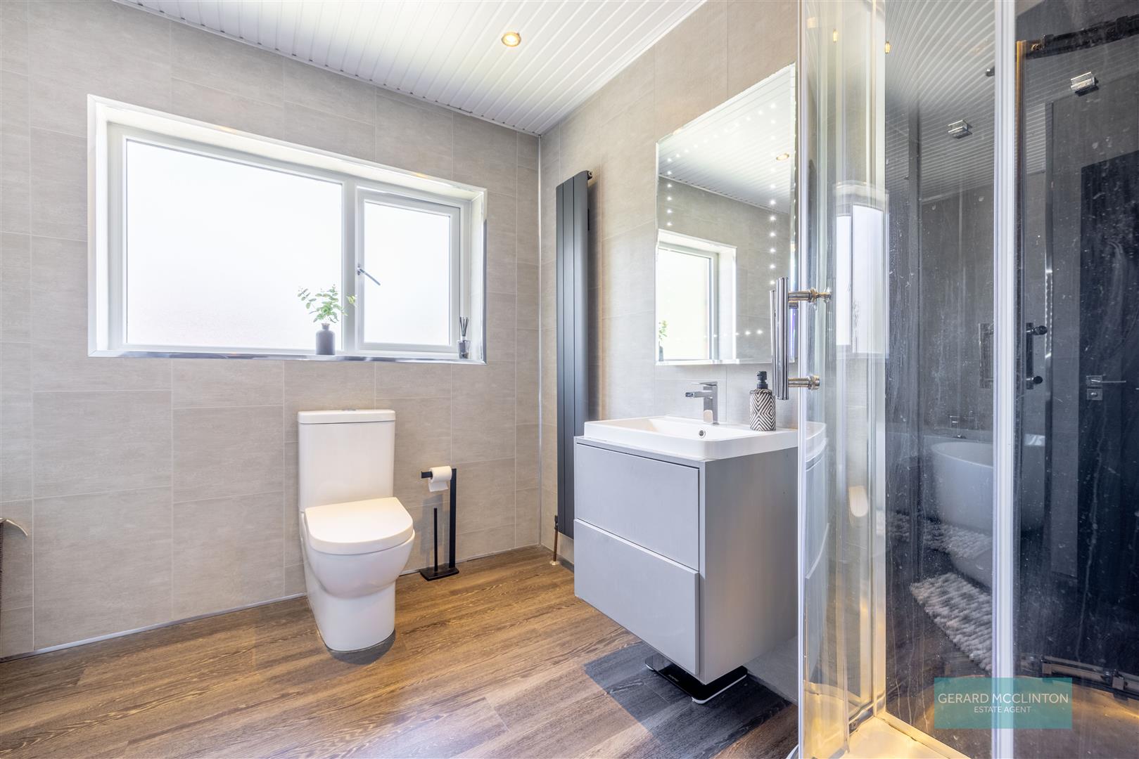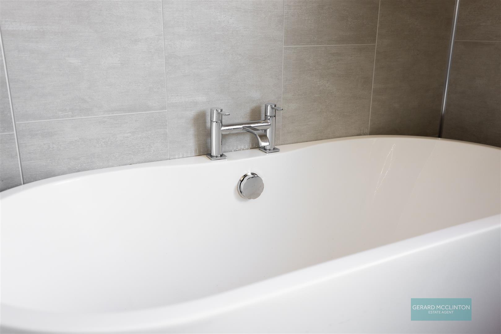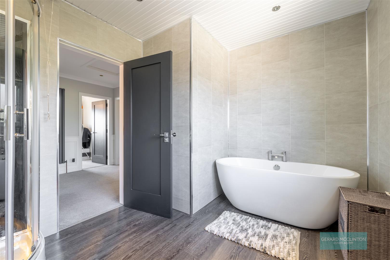 Modern suite consisting of low flush WC. Floating vanity sink unit with waterfall style mixer tap. Free standing bath with central mixer tap. Corner shower unit with PVC panelling and electric shower fitting. PVC panelled walls and ceiling. Feature vertical grey radiator. Recessed spotlights. Laminate floor.