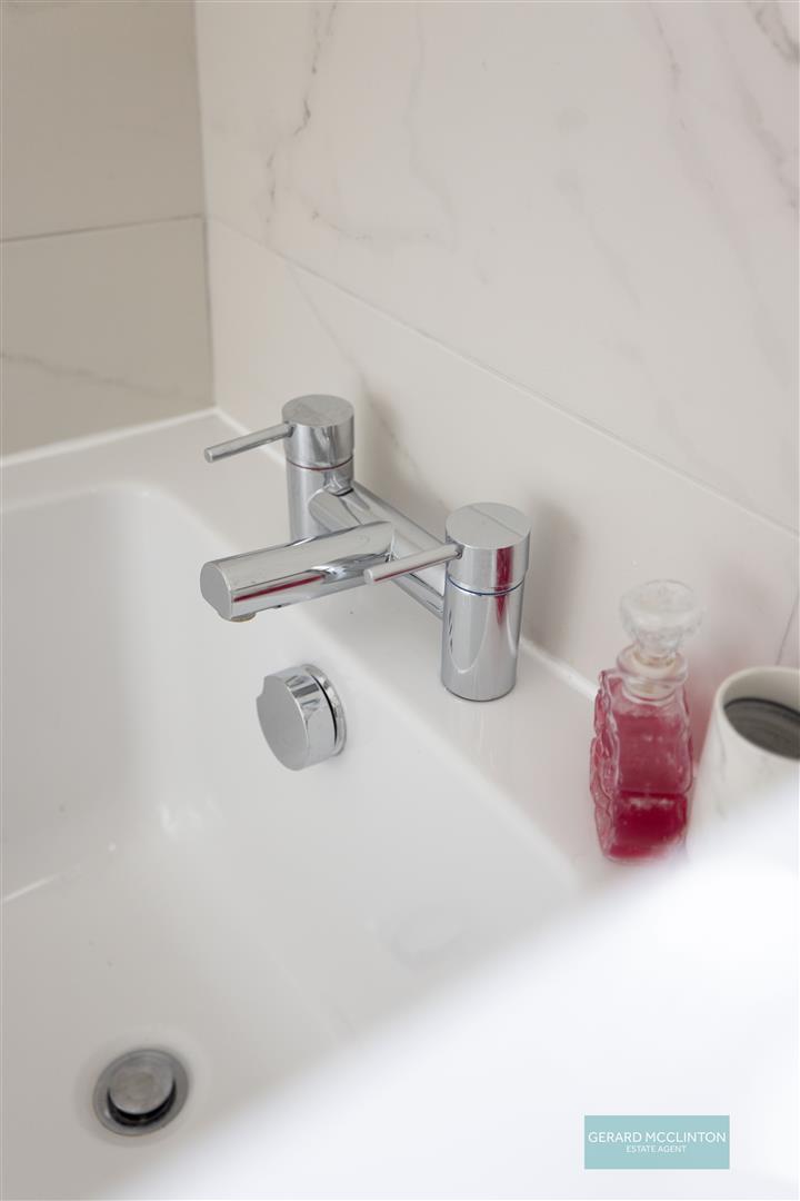 Upstairs, the property continues to impress with three comfortable bedrooms, all well-proportioned and designed with family living in mind. There is a fixed staircase to the roofspace. This area has a roof window, light, power and flooring. The main family bathroom was upgraded and now has a panelled bath and separate shower cubicle.