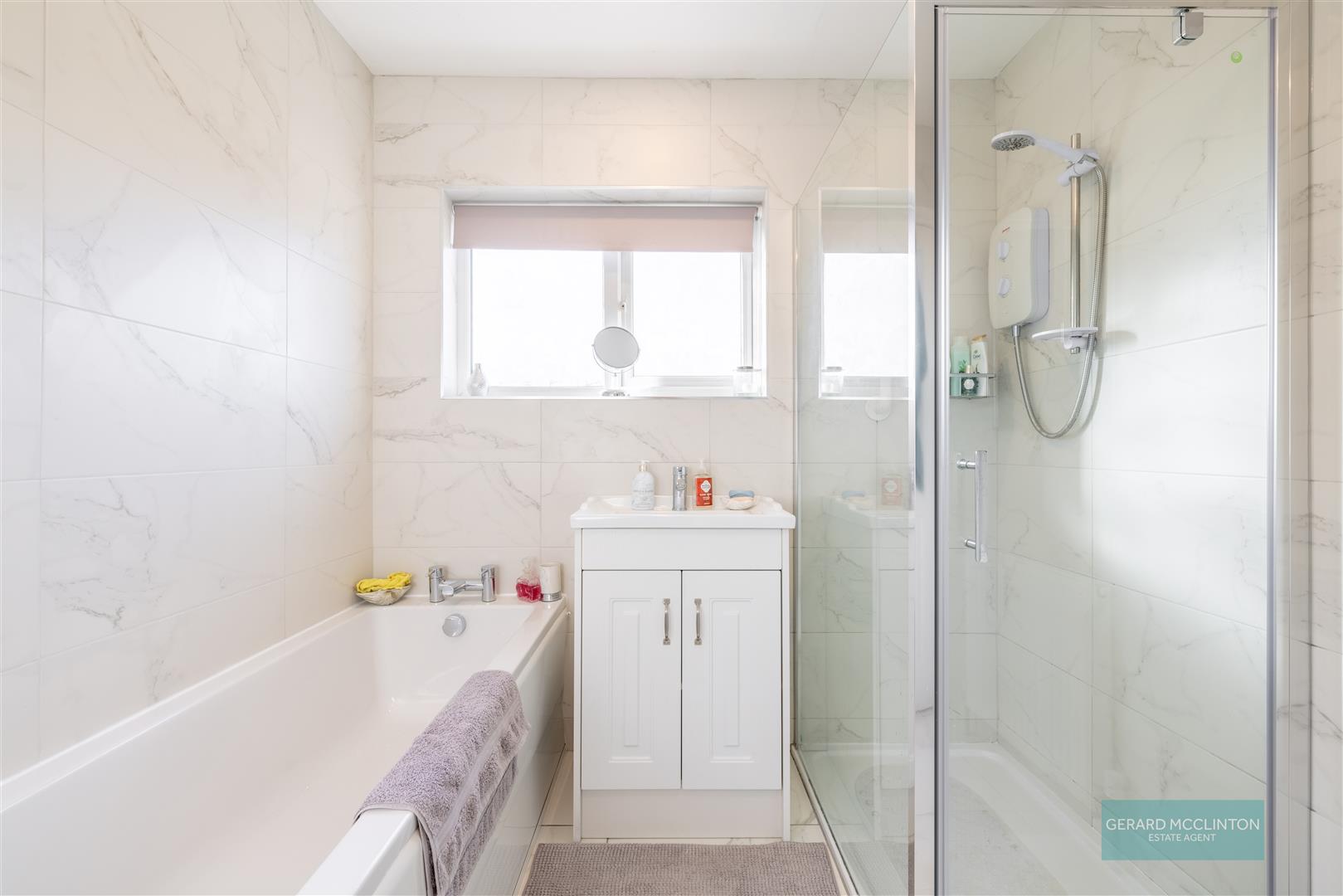 Upvc double glazed window to side and rear, tiled floor, tiled walls, close coupled wc, pedestal wash hand basin with vanity unit and mixer tap, panelled bath with mixer tap, shower cubicle with electric shower