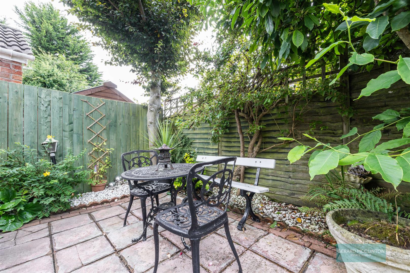 Front garden, laid to lawn with mature shrubs surrounding, driveway to side leading to garage. Rear Garden laid to lawn and two paved patio areas.