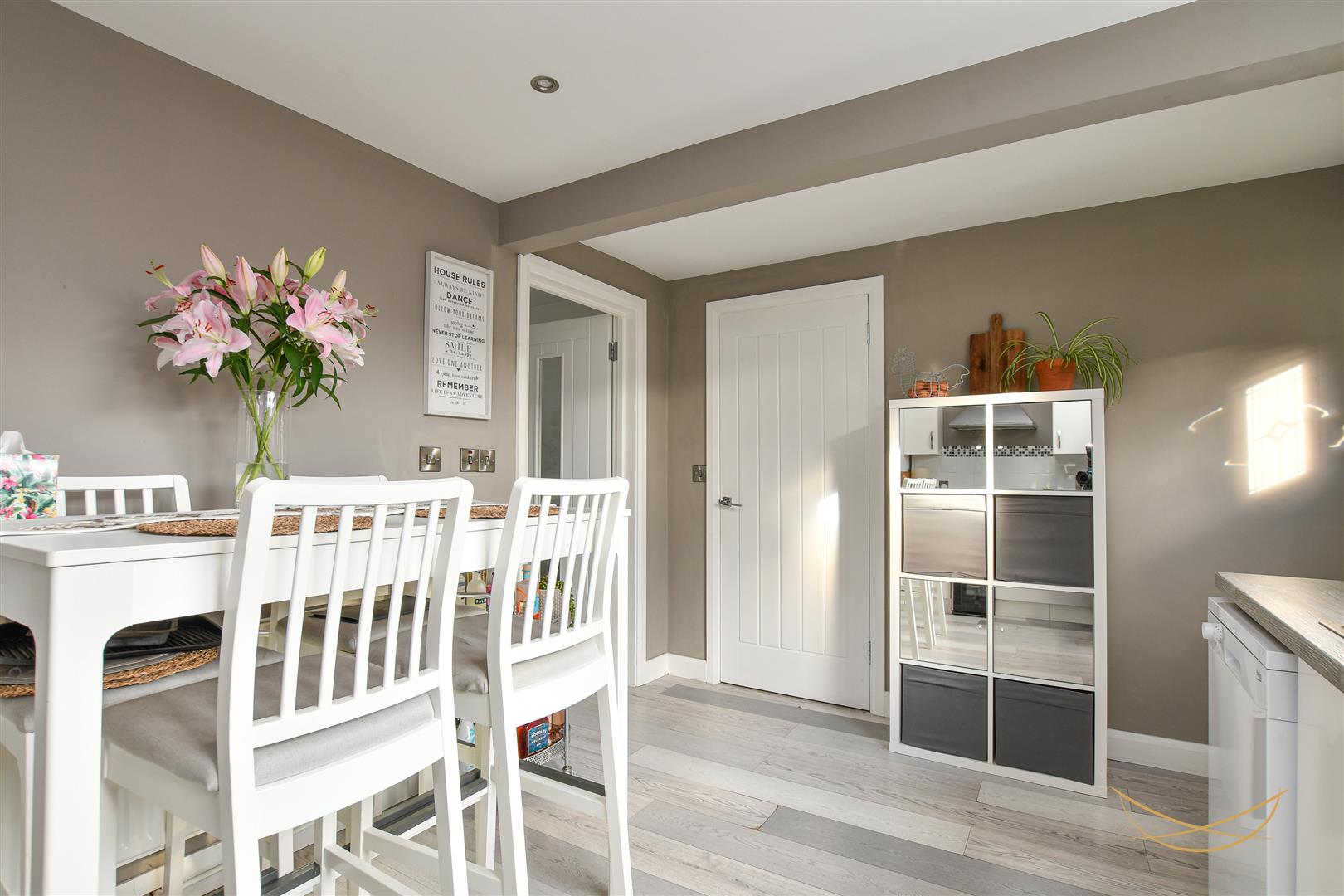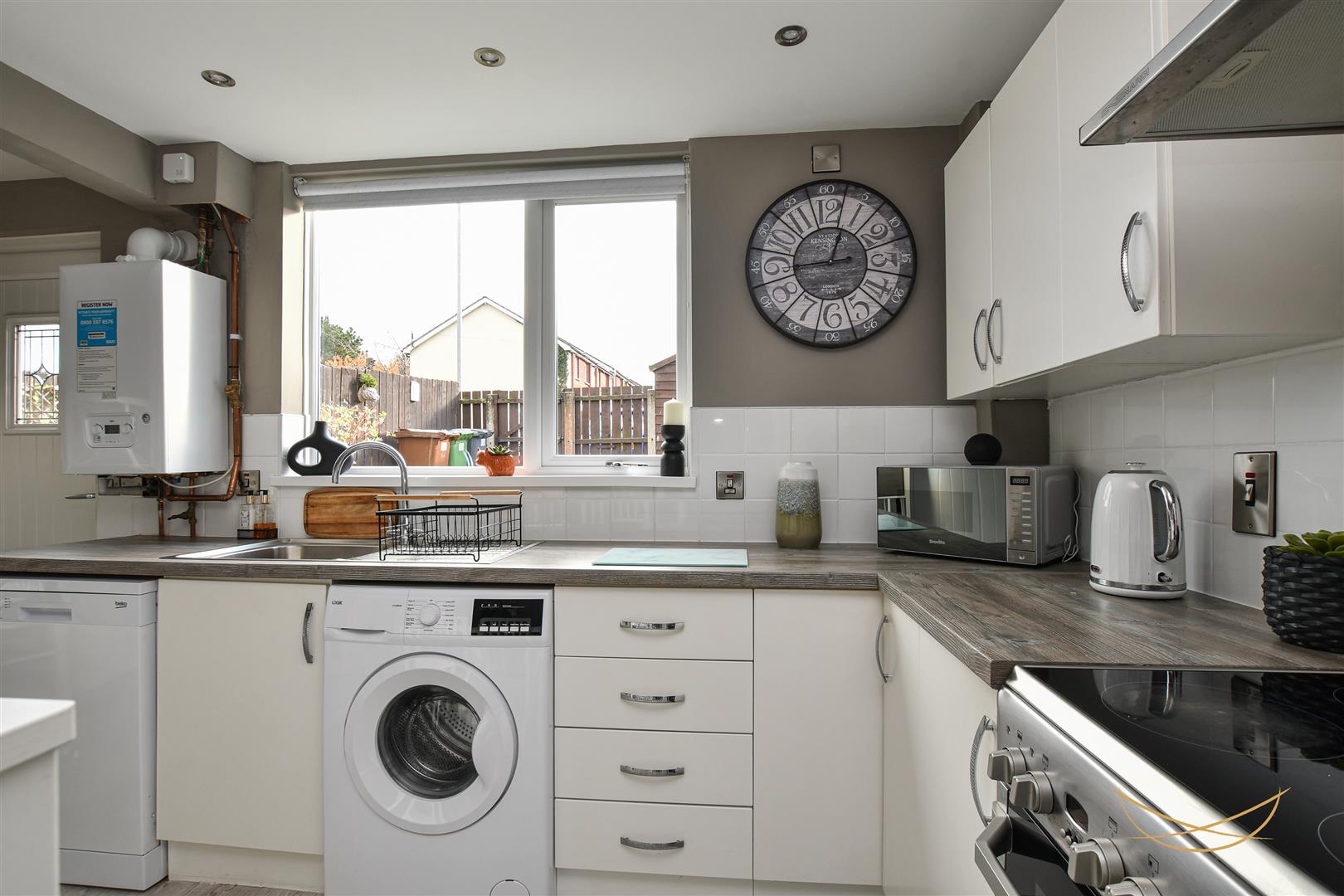 Range of high and low level units with contrasting formica worktops. Tiled splashback with mosaic border. Stainless steel overhead extractor fan. Plumbed for appliances. uPVC external door leading to rear garden.
