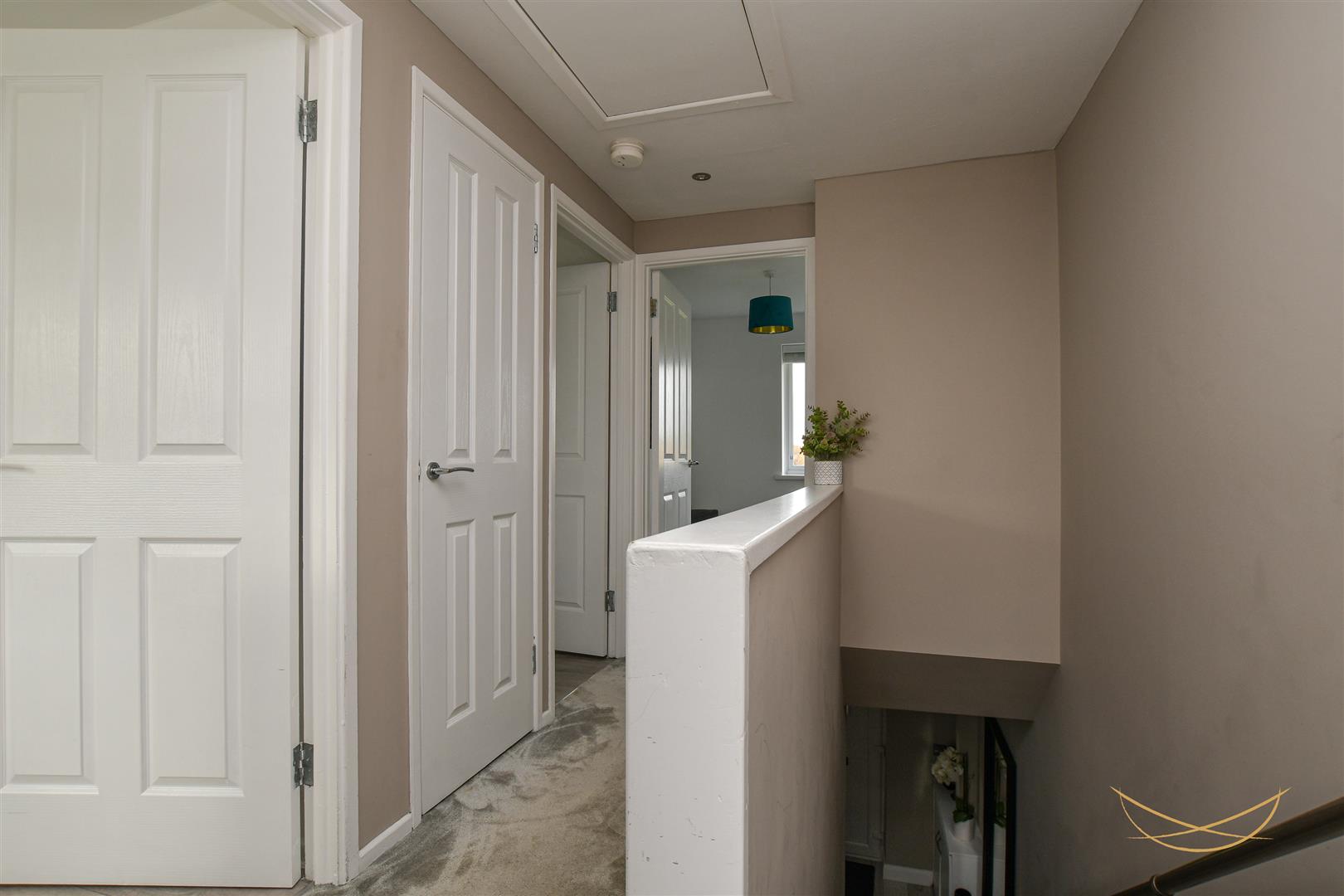 uPVC external door with glazed inset leading to hallway. Wood effect laminate flooring. Access to stairway.