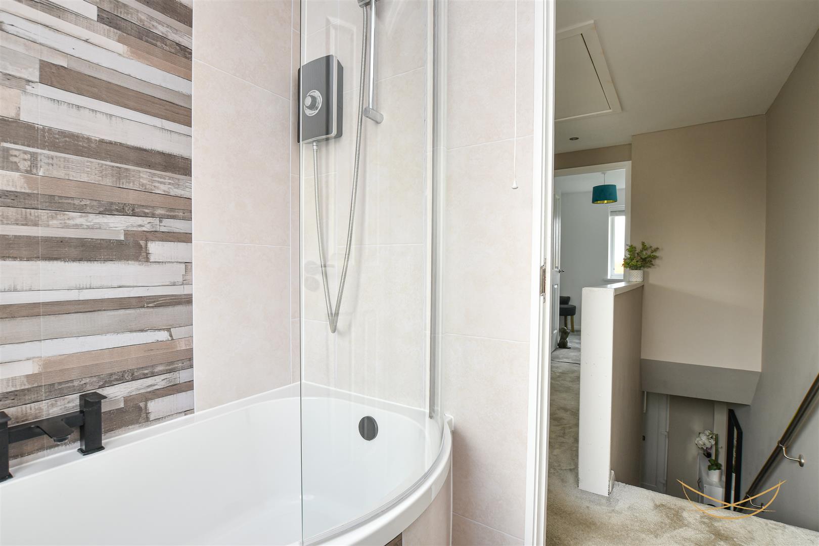 Three piece bathroom suite comprising panelled bath, low flush w/c, floating vanity unit with mixer tap. Overhead chrome shower unit. PVC multi-panels.