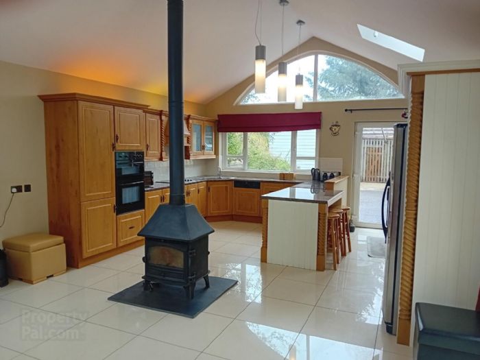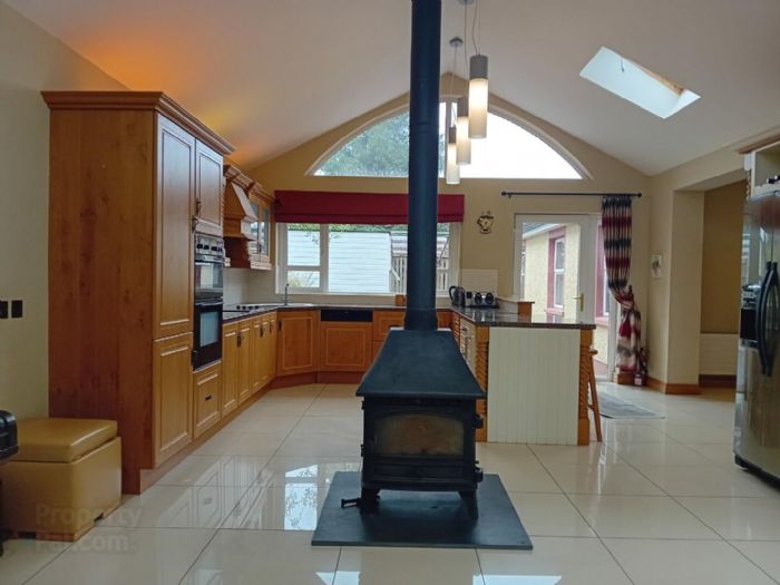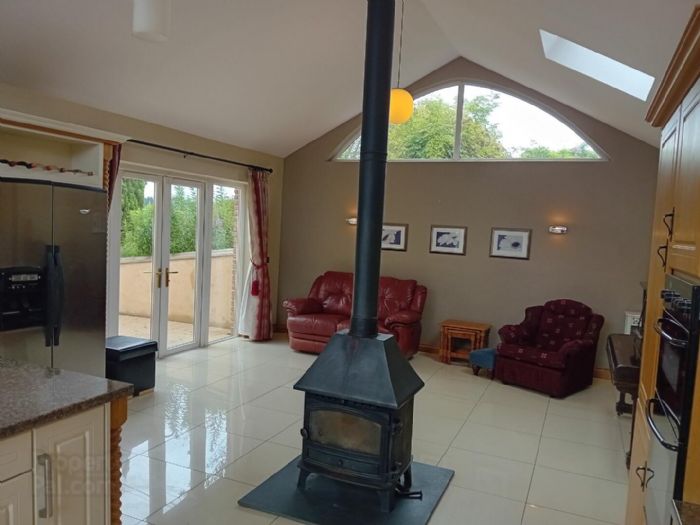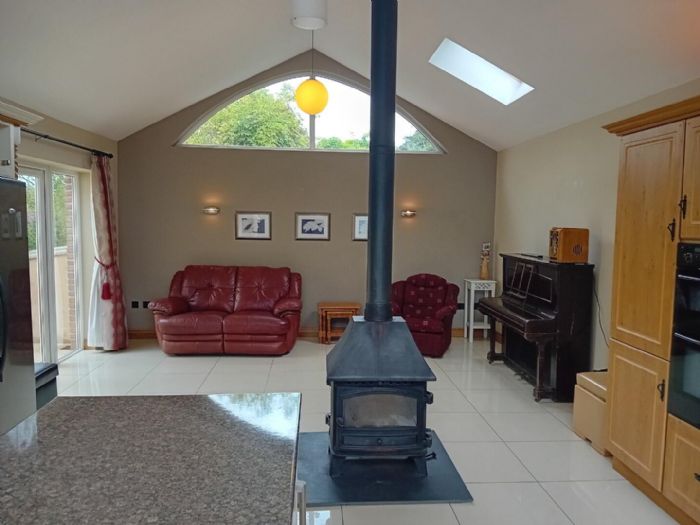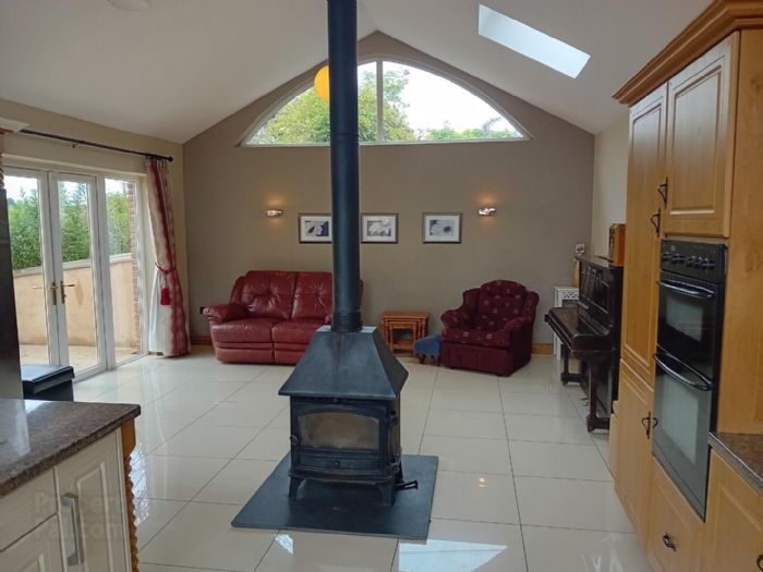 8.1m X 4.9m and 3.9m X 3.6m full fitted white oak kitchen units with stainless steel sink, fully tiled splashback, 'Bosch' integrated dishwasher, 'Whirlpool' 4 ring electric hob and fan assisted oven, 'Whirlpool' integrated electric grill and separate oven, 'Whirlpool' american style double door fridge freezer, freestanding wood burning stove, breakfast bar/island, large hard tile floor, vaulted ceiling with skylights, PVC french doors opening to sheltered patio area. Combination of hanging, display and recessed lighting. Fitted display unit in dining room.