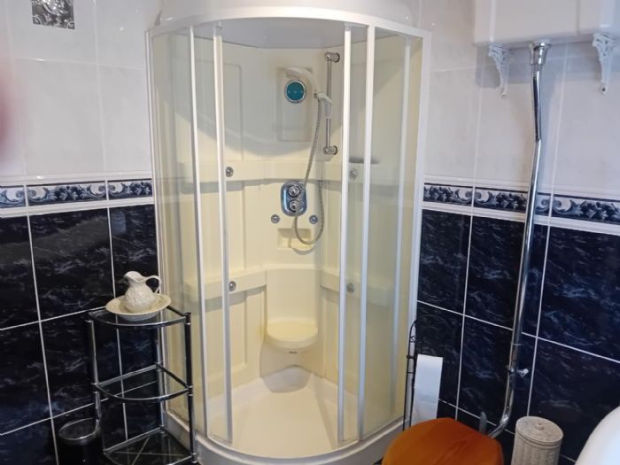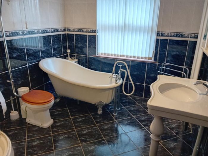 3m X 2.7m 'Adelphi' sanitaryware, high level pull chain WC and consol wash hand basin, freestanding bath with chrome shower taps, Luxurious steam shower in self contained cubicle, hard tile floor, walls tiled floor to ceiling, towel radiator.