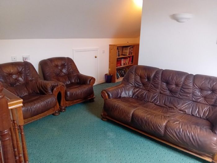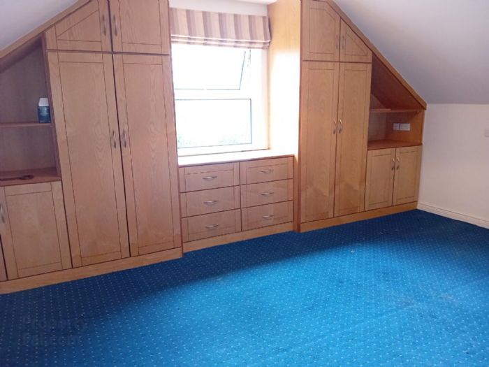 4.2m X 3.5 Carpet flooring, large gable window, fitted units incorporating some display portions, timber tongued and grooved ceiling, eaves access.