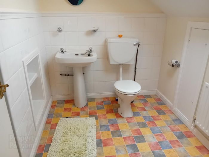 2.3m X 2.7m (into shower) White WC and wash hand basin, 'Mira Event XS' shower in self contained cubicle. Lino flooring, walls tiled to dado rail with fully tiled splashback, sky light.