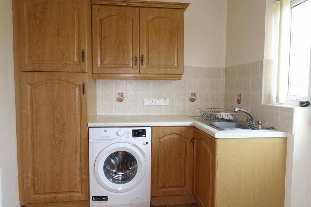 Fitted units, stainless steel sink unit, plumbed for washing machine, PVC exterior door with glazed inset, tile flooring & splash back