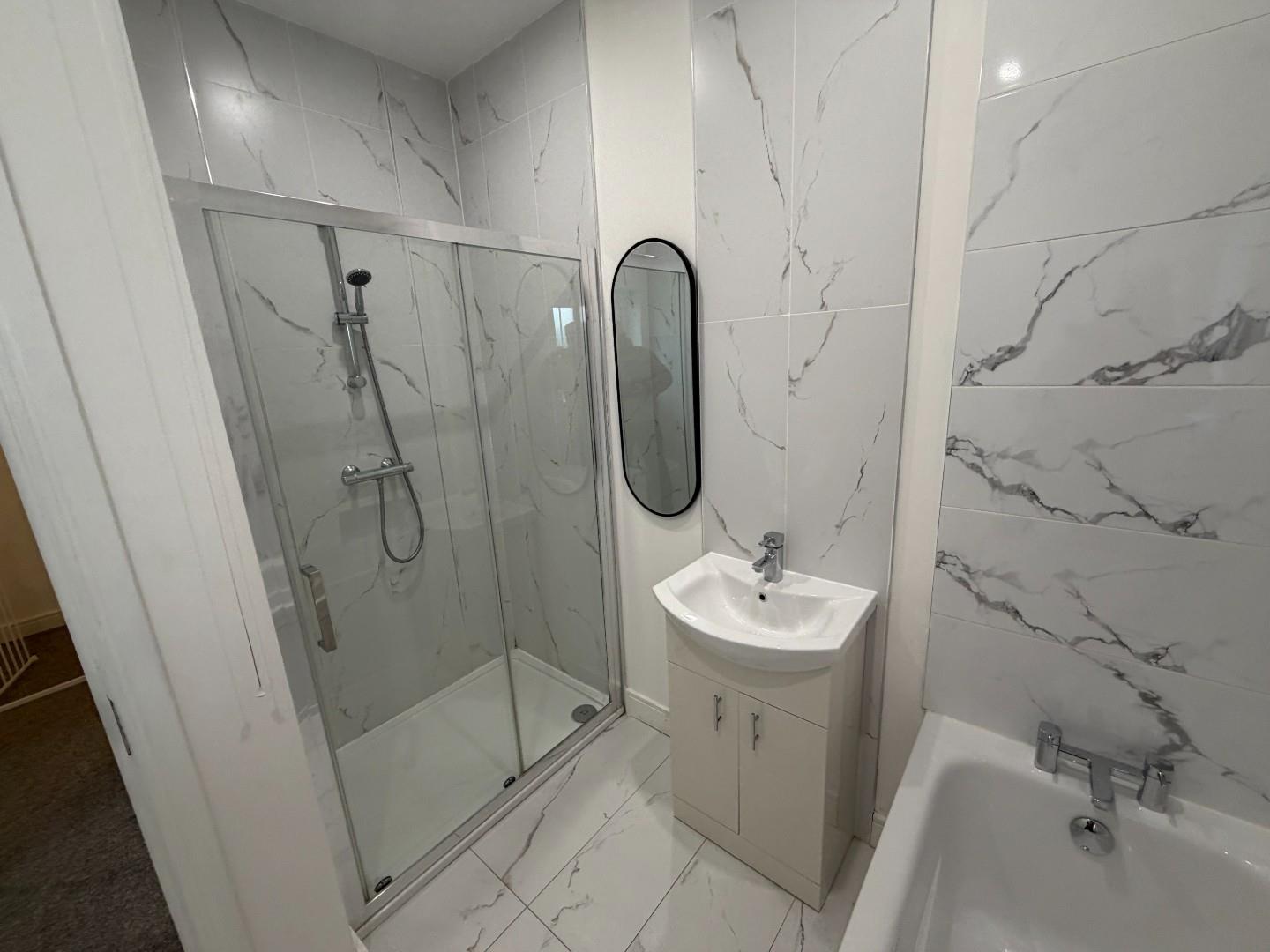 White suite, with LFWC, panel bath and wash hand basin with storage below and double shower with glass doors and pressure shower. extractor, chrome radiator, tiled floor and part tiled wall. recessed lights.