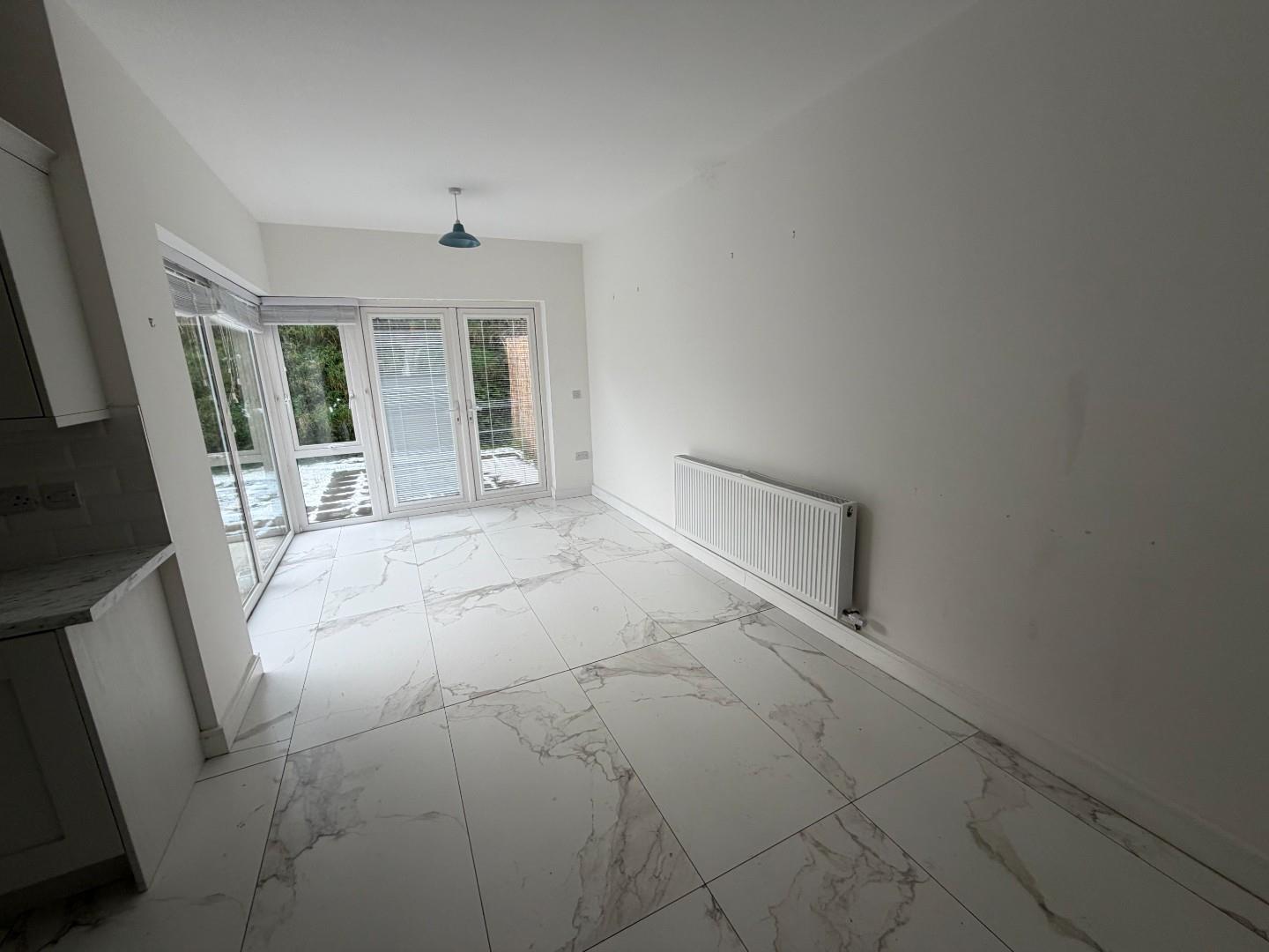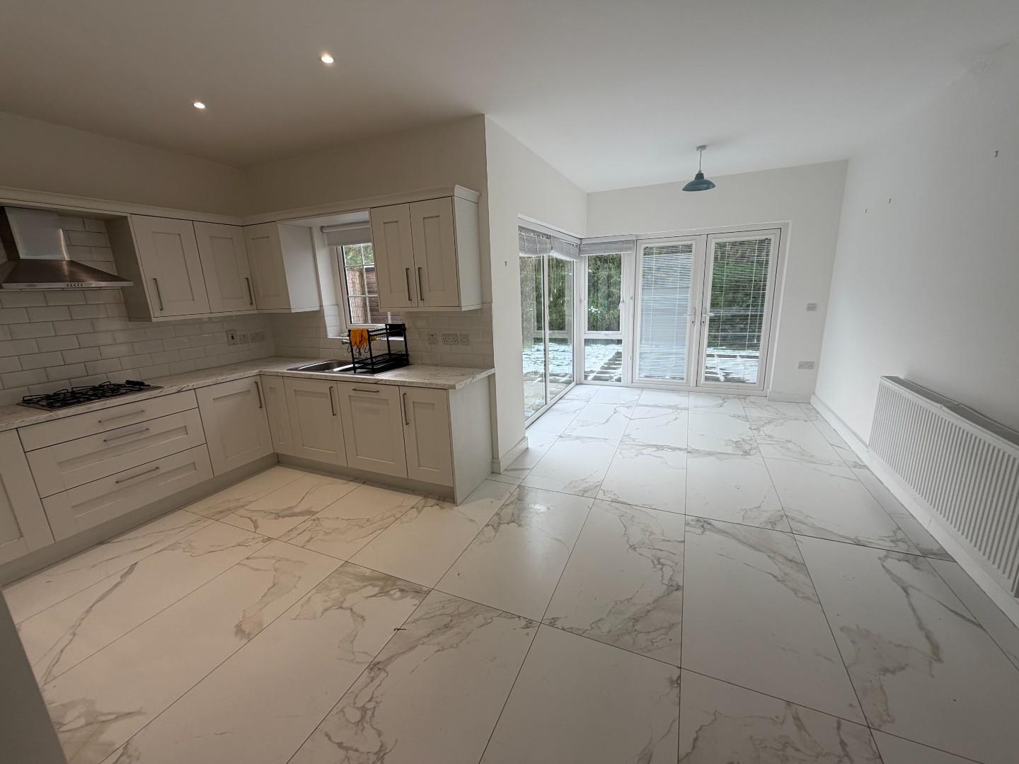 This spacious bright L-shaped rooms has room for table and chairs and sofa and sitting area. The modern kitchen has high and low level units, with 11/2 stainless steel sink and drainer, integrated gas hob and electric oven with stainless steel extractor above, integrated Fridge freezer and dishwasher, tiled floor, recessed lights and double doors to patio and garden area.