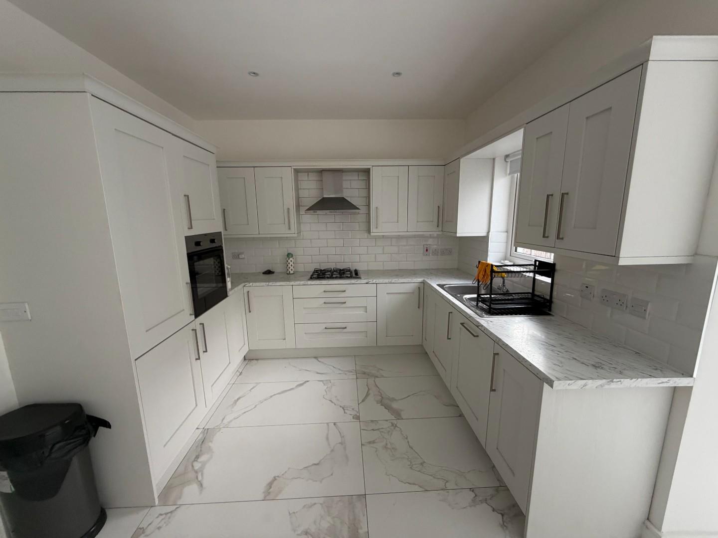 High and low level units, stainless steel sink and drainer, Gas Boiler, plumbed for washing machine and dryer. tiled floor, extractor. door to side drive.