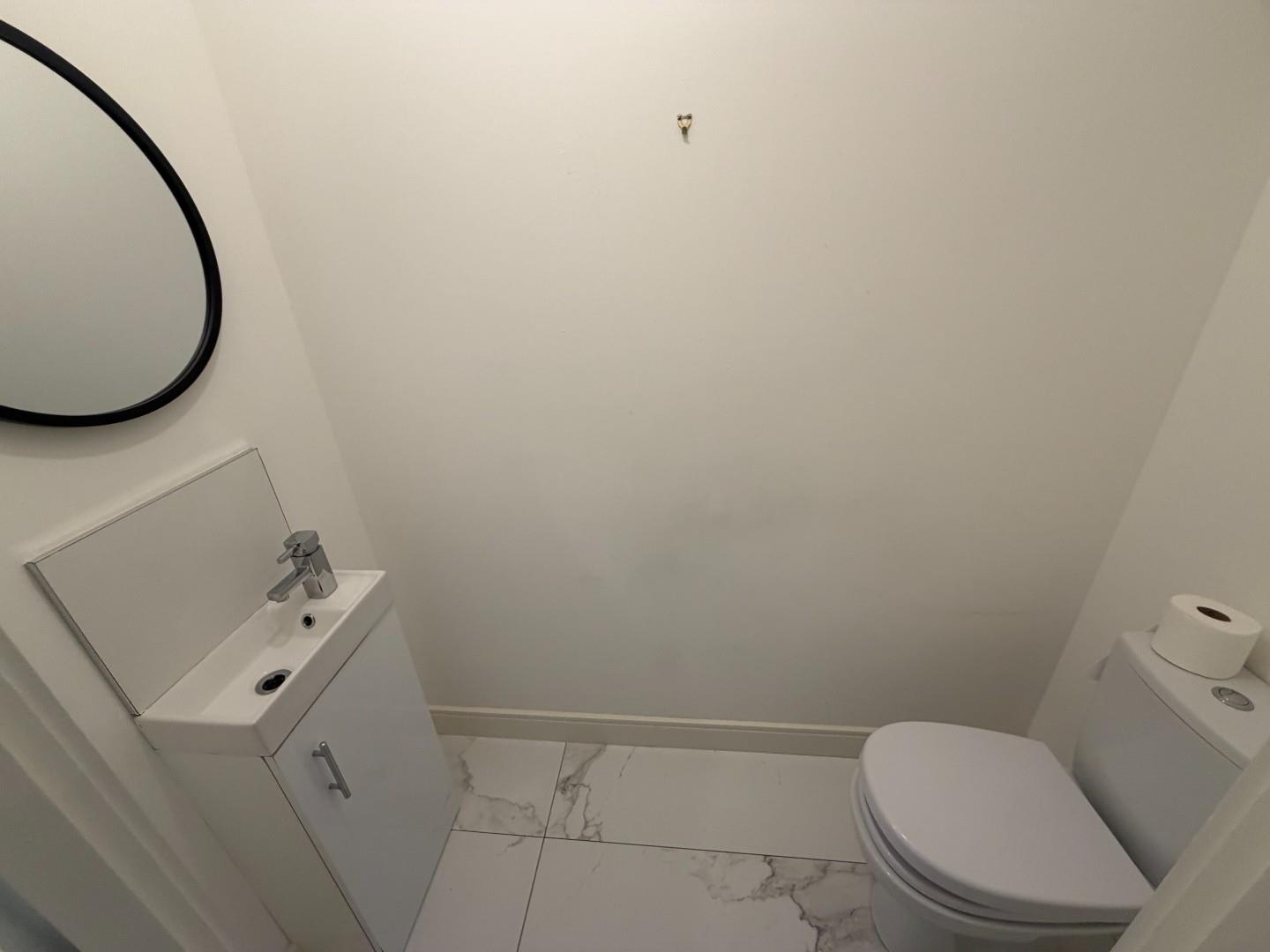 Downstairs cloaks with LFWC, Wash hand basin and storage, tiled floor, part tiled wall, extractor.