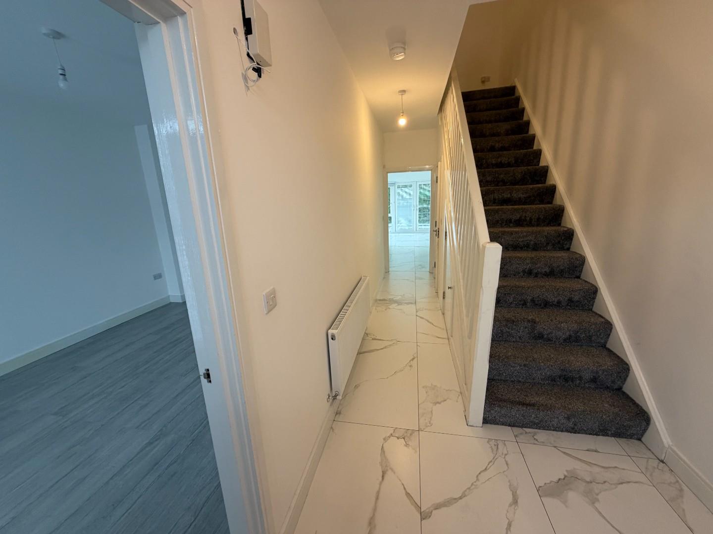 Composite PVC door to bright tiled hallway with under stairs storage.