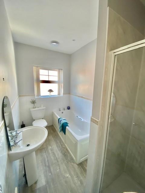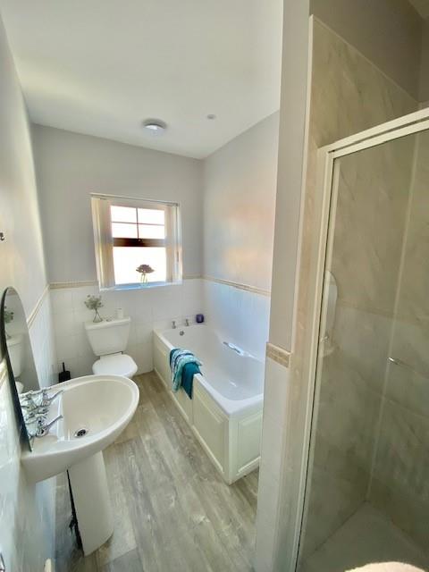 White suite with LFWC, pedestal wash hand basin, panel bath and shower unit with PVC walling and electric shower and glass door. extractor, towel Rad. Part tiled wall.