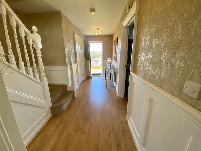 Solid wood front door to hallway with laminate flooring, wood panel wall,