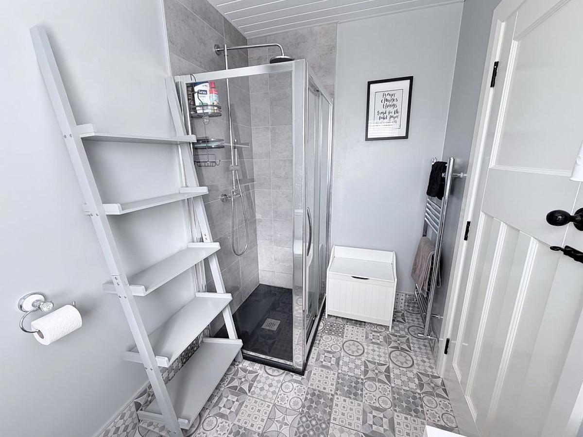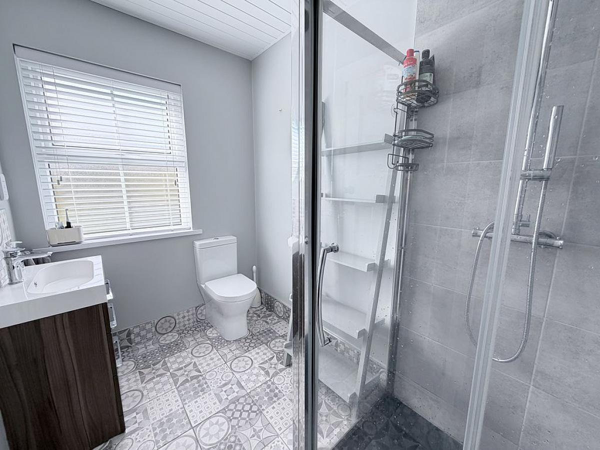 White suite comprising close coupled WC, vanity unit with wash hand basin and mixer tap and shower cubicle with slate stone tray and thermostatic mixer shower with handheld and rain head attachments. Fully tiled walls, tiled floor, PVC panelled ceiling, heated chrome towel rail.