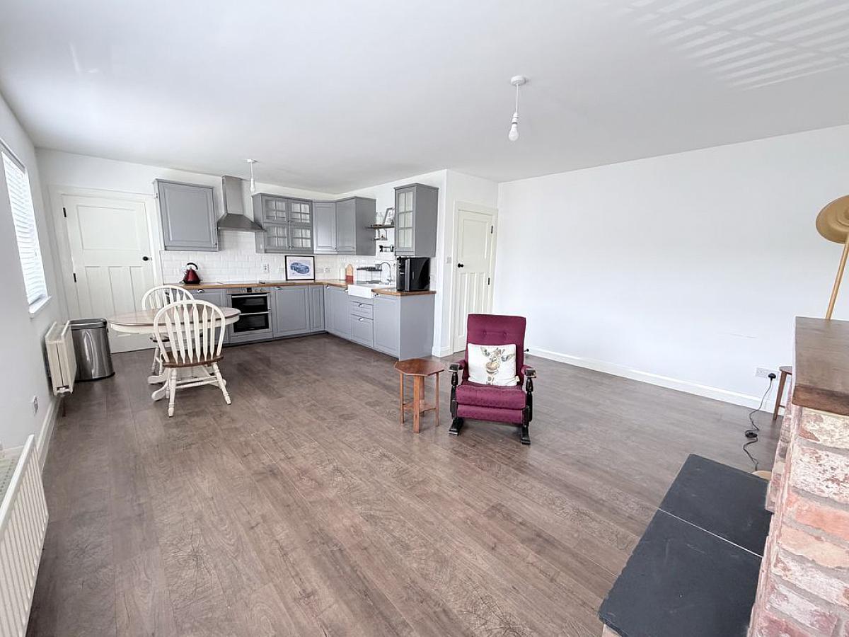 Focal feature brick fireplace with slate tiled hearth wired for electrical fire, TV aerial point, laminate wooden floor. Full range of high and low level fitted modern units with solid wood worktops and feature ceramic sink with mixer tap, built-in electric double oven and hob with stainless steel extractor hood, built-in under unit fridge and freezer, part tiled walls, built-in storage cupboard with plumbing for automatic washing machine. 2 double radiators.