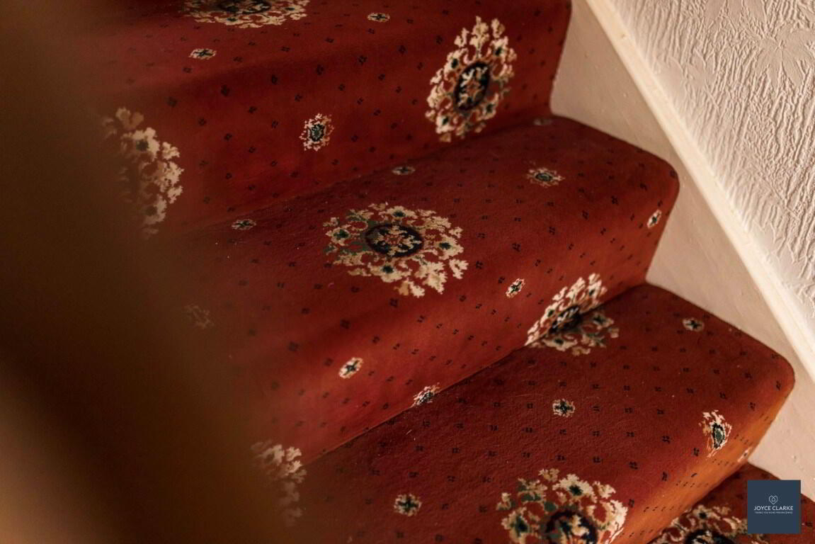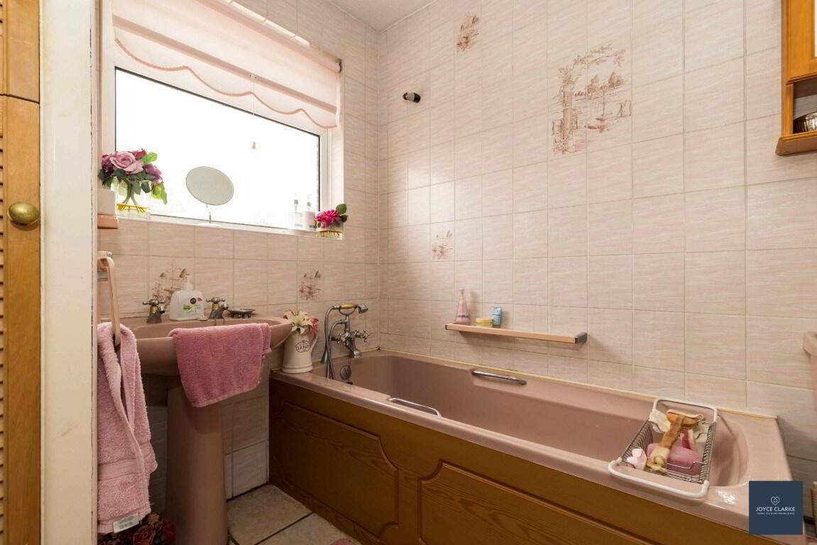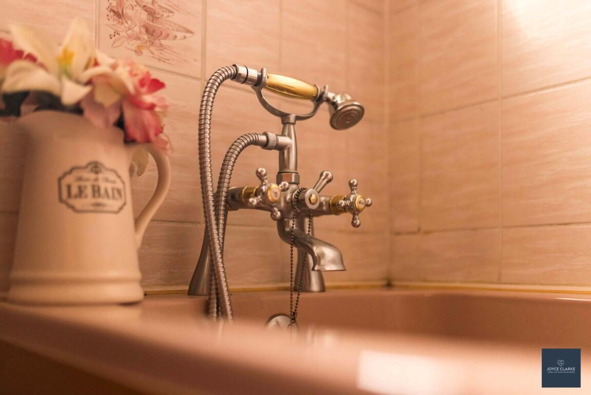 Fully tiled suite with WC, pedestal style sink, bath with telephone shower head attachment. Hotpress. Window. Single panel radiator. Access to roofspace.