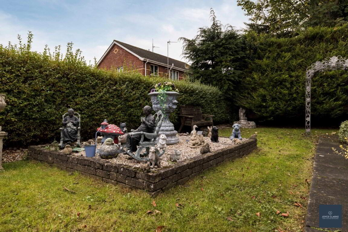 Garden laid in lawn with ornate stoned feature bed. Tarmac driveway to side with double gates.