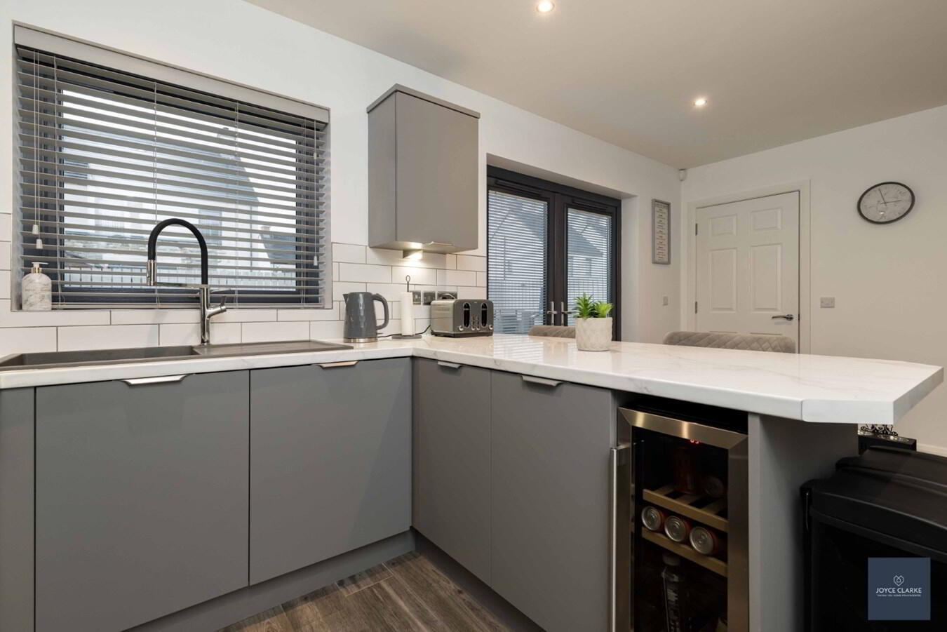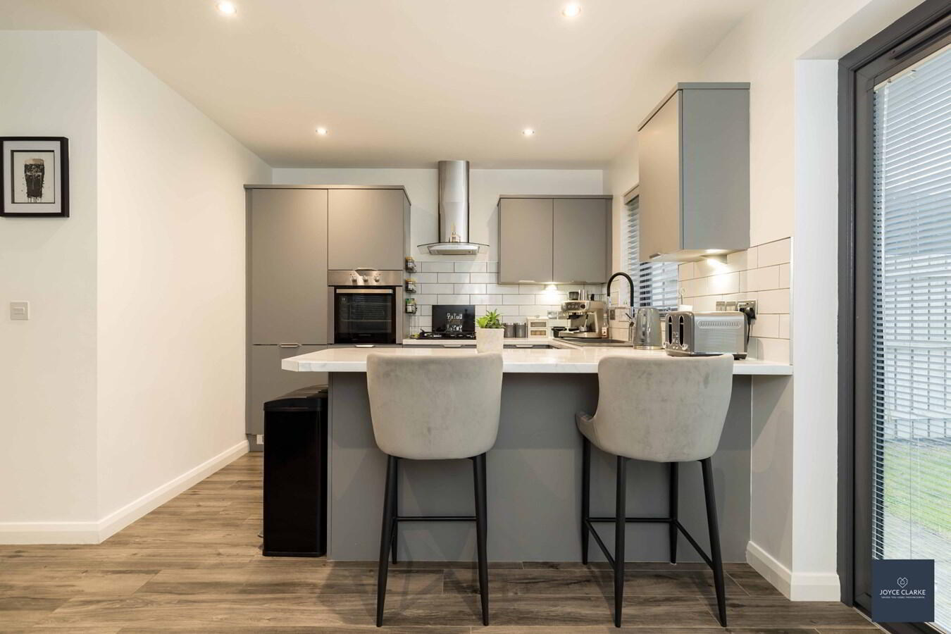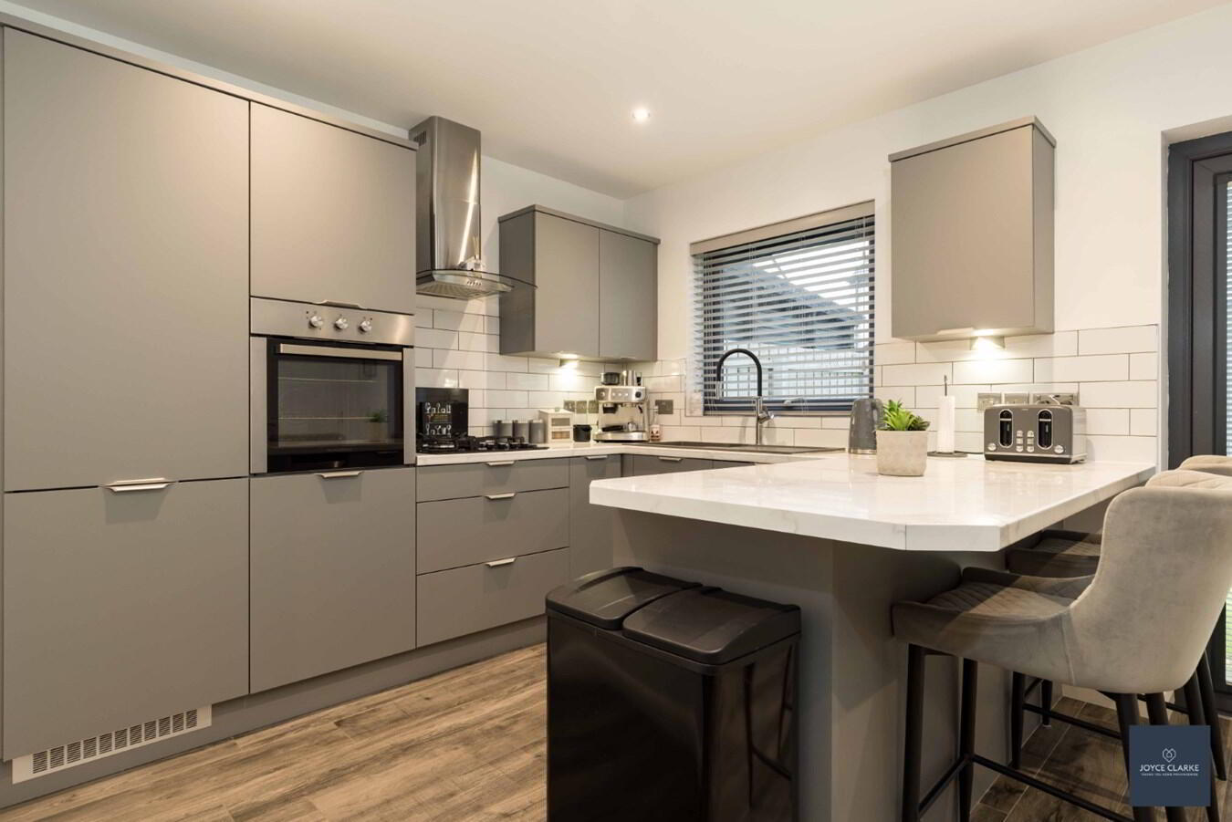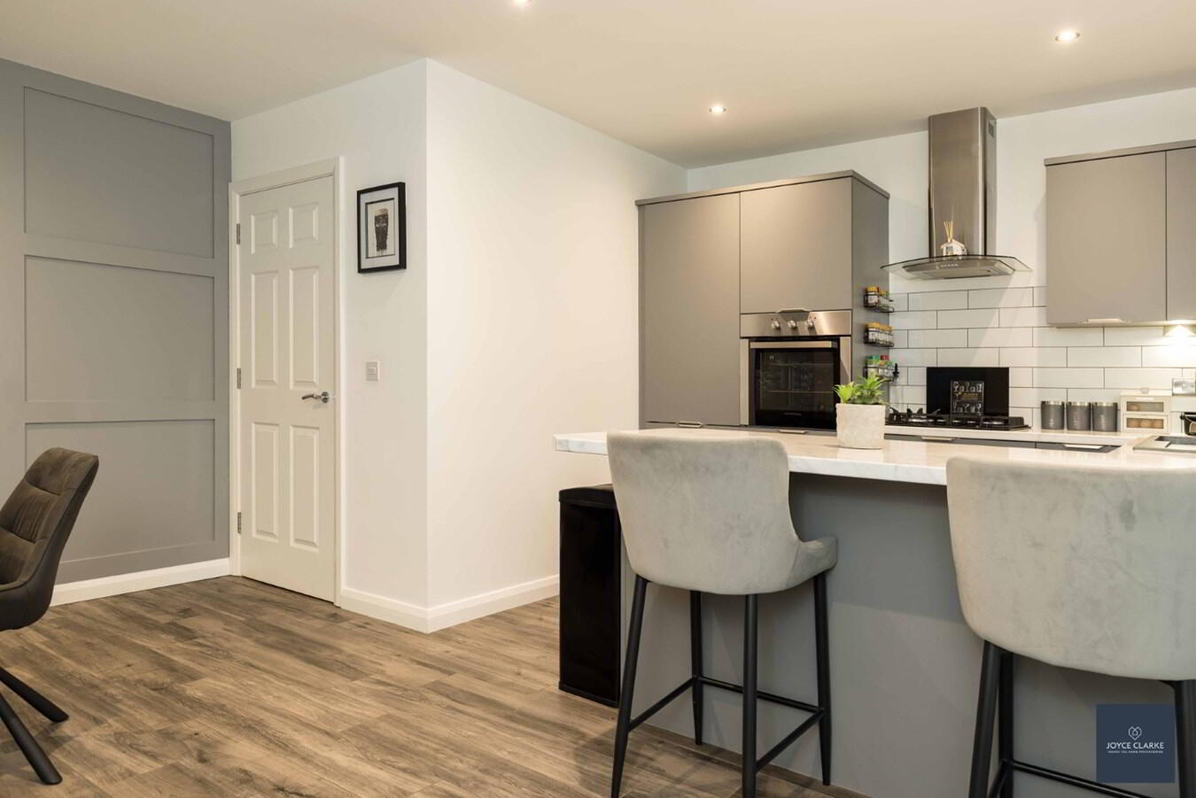 Beautifully designed contemporary kitchen with a range of high and low level units and breakfast bar. Integrated appliances to include eye level NORDMENDE oven, NORDMENDE dish washer, four ring gas hob with stainless steel extractor over. Composite sink and drainer with mixer tap. Attractive wall panelling. Patio doors to rear. Recessed lighting. Double panel radiator.