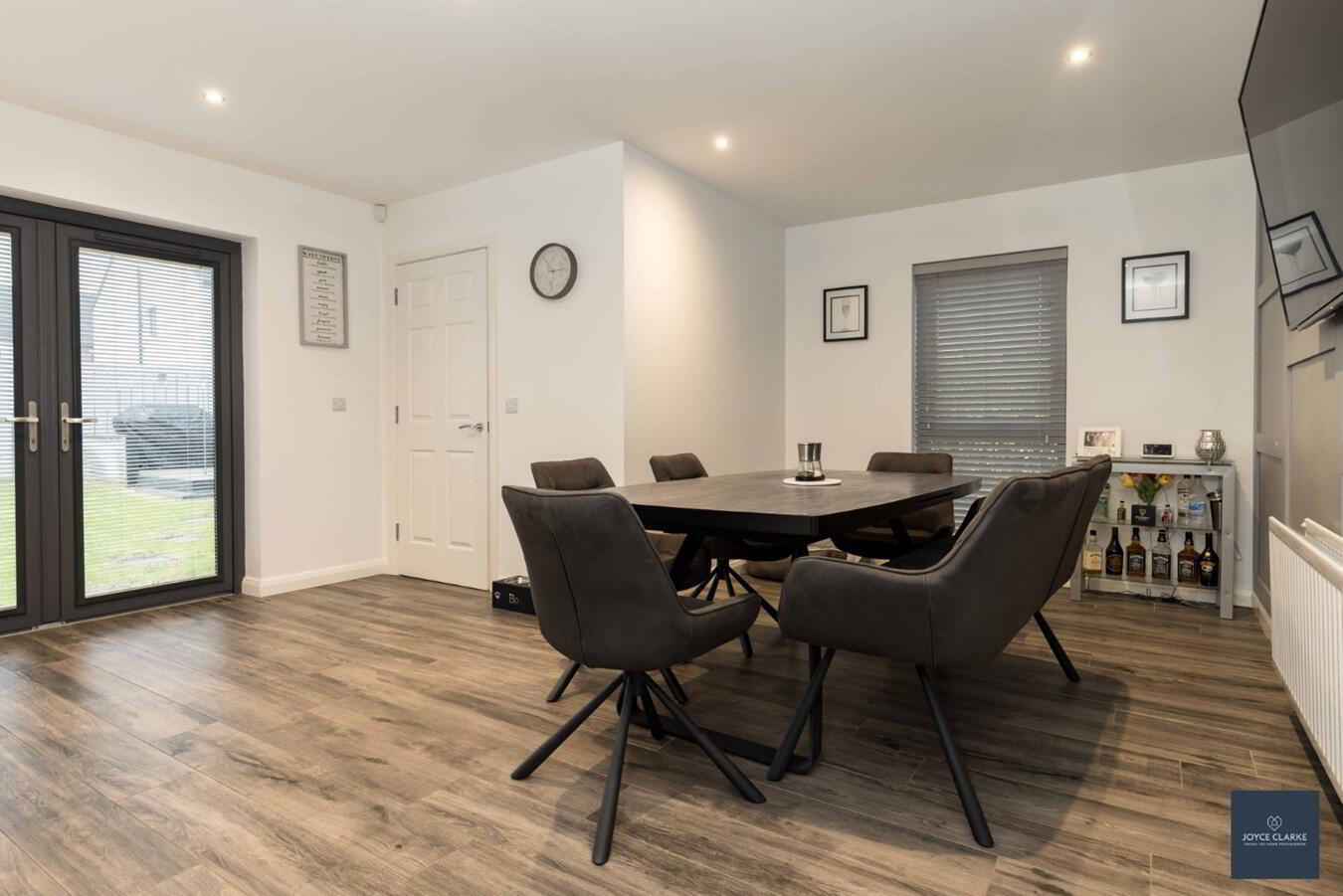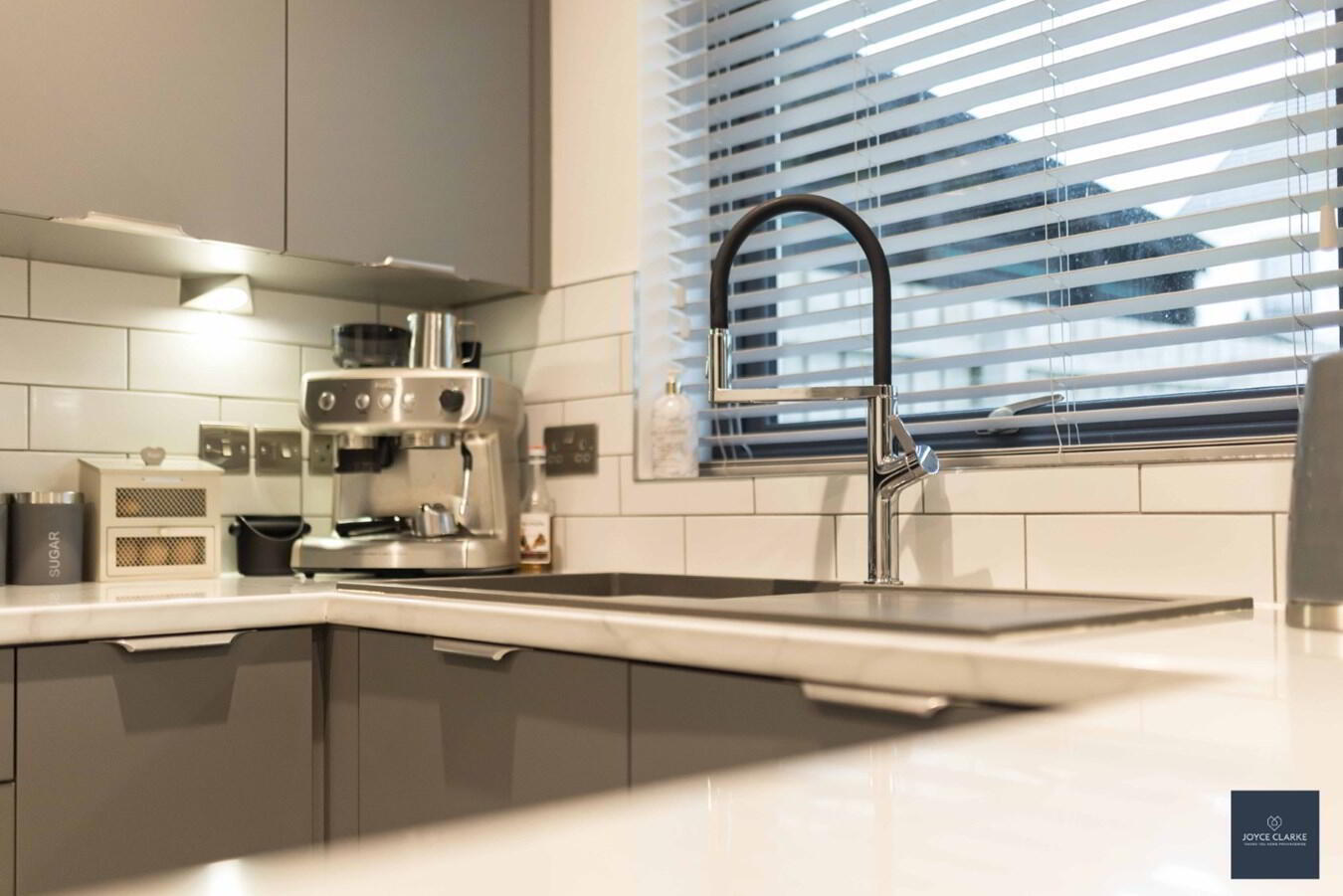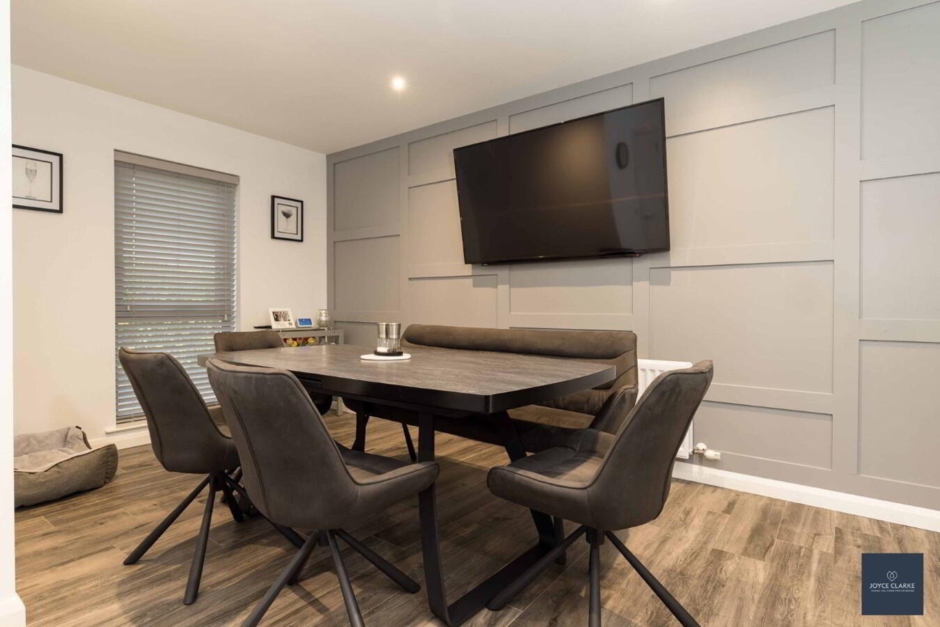 Beautifully designed contemporary kitchen with a range of high and low level units and breakfast bar. Integrated appliances to include eye level NORDMENDE oven, NORDMENDE dish washer, four ring gas hob with stainless steel extractor over. Composite sink and drainer with mixer tap. Attractive wall panelling. Patio doors to rear. Recessed lighting. Double panel radiator.