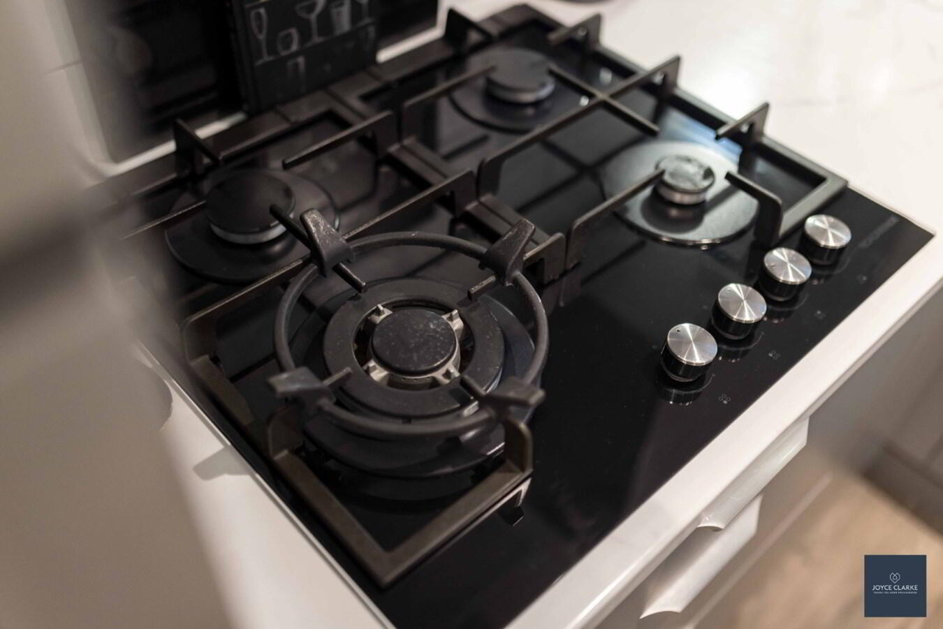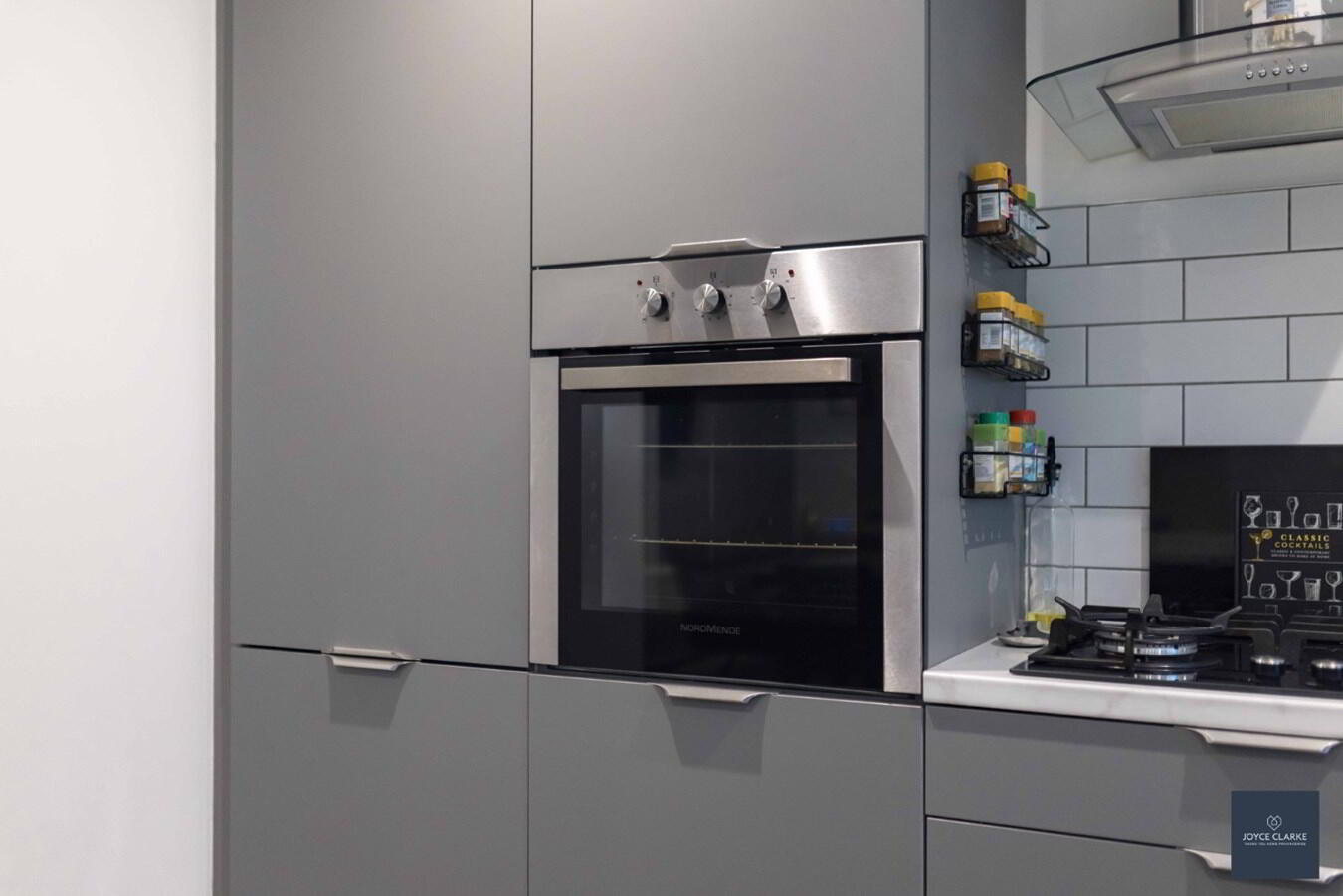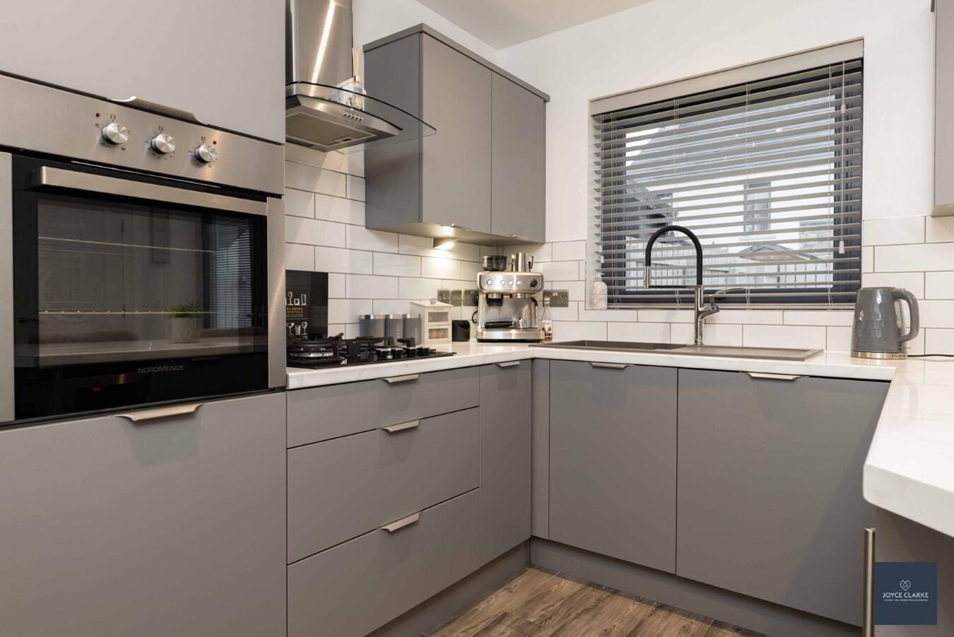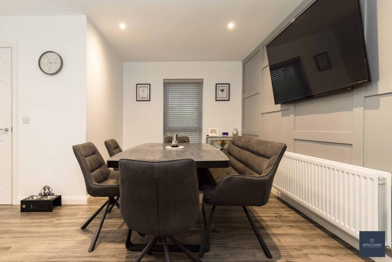 Beautifully designed contemporary kitchen with a range of high and low level units and breakfast bar. Integrated appliances to include eye level NORDMENDE oven, NORDMENDE dish washer, four ring gas hob with stainless steel extractor over. Composite sink and drainer with mixer tap. Attractive wall panelling. Patio doors to rear. Recessed lighting. Double panel radiator.