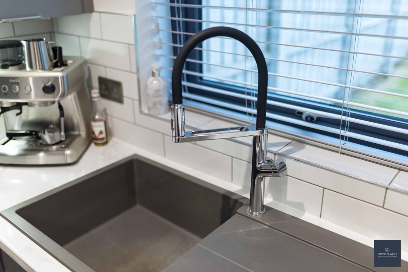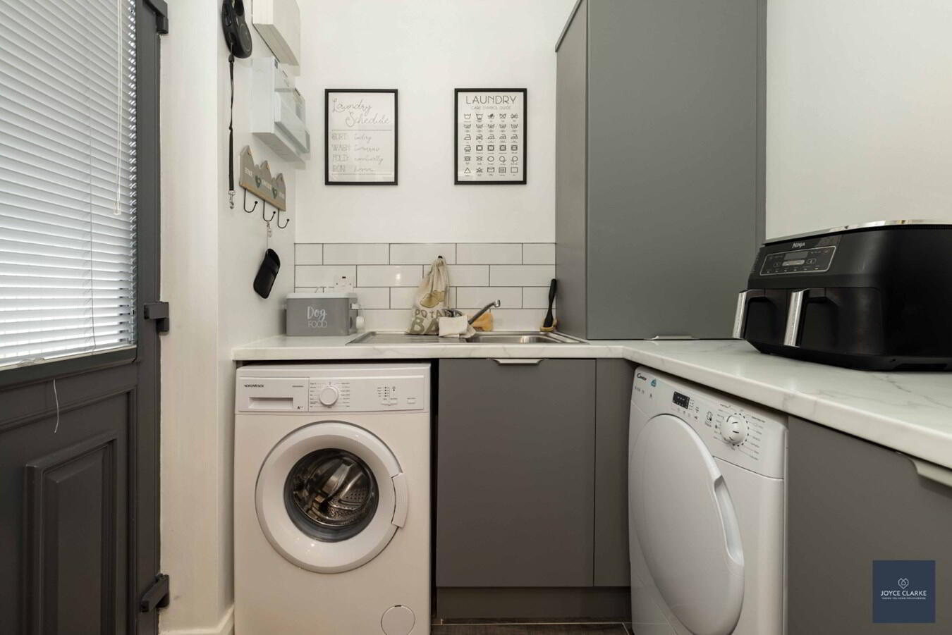 Low level units. Space for washing machine and tumble drier. Stainless steel sink and drainer with mixer tap. Part glazed UPVC door to rear. Tiled floor and splash back.