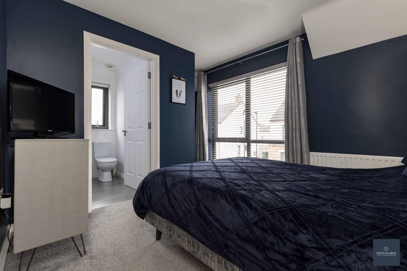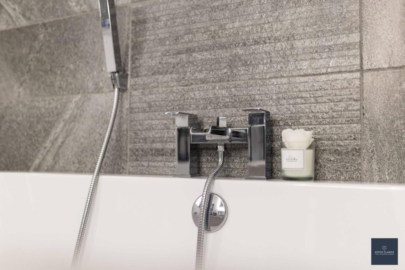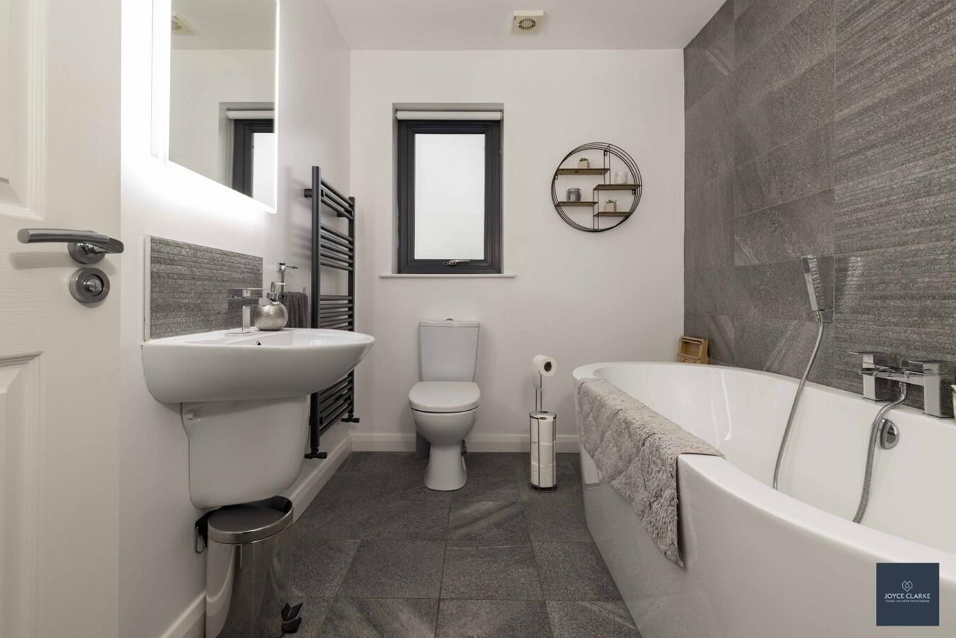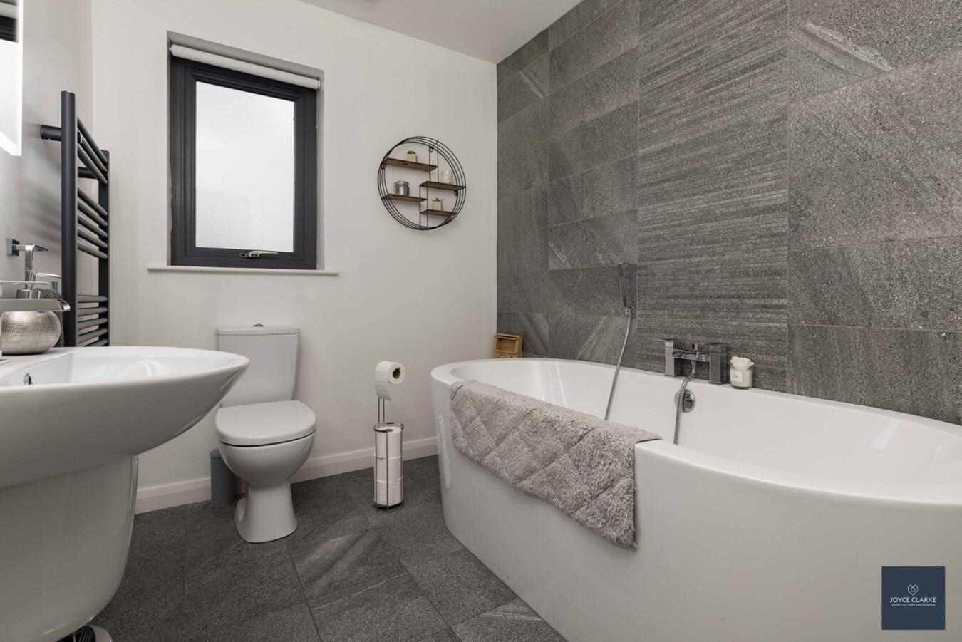 Modern suite comprising of free standing bath with centre taps and shower attachment. Floating sink with mixer tap. Back to wall dual flush WC. Heated towel rail. Tiled floor, splash back and feature wall. Recessed lighting. Window. Extractor.
