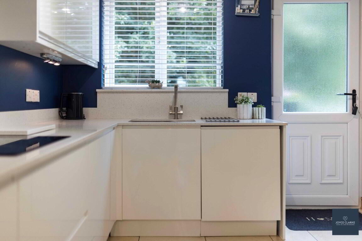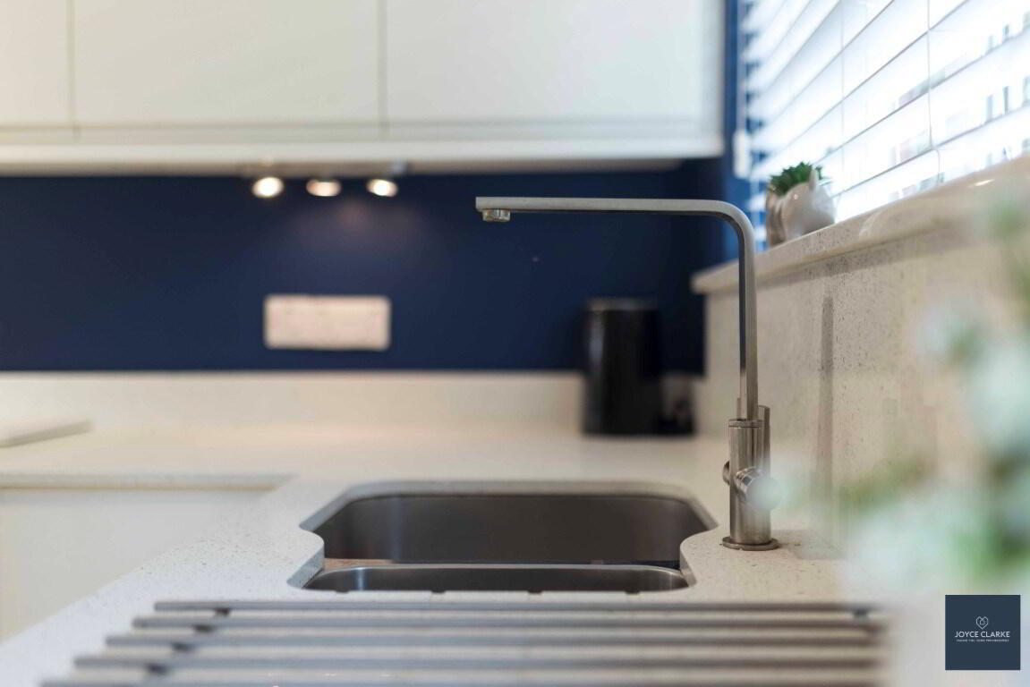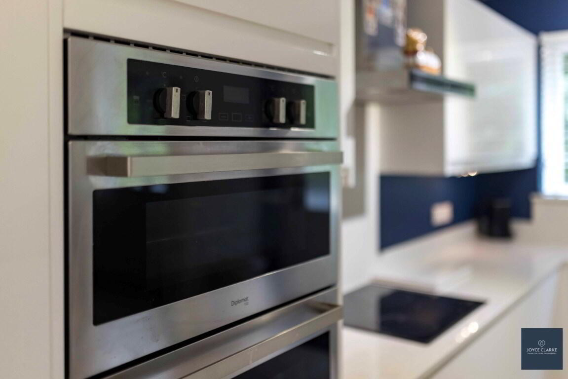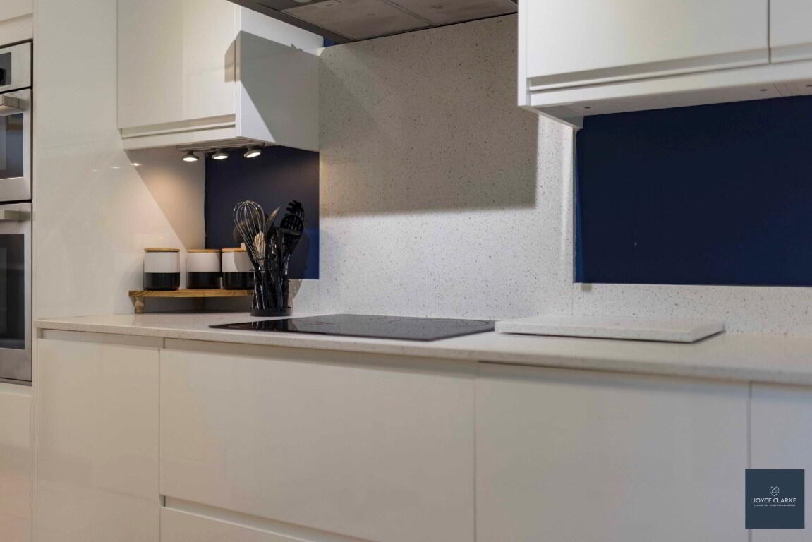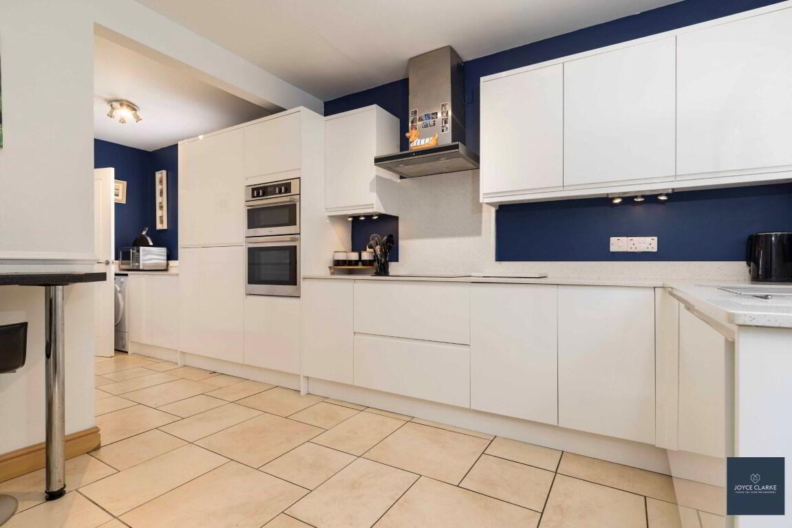 Modern white gloss kitchen excellent range of kitchen cabinets large saucepan drawers and put out larder, wired for under unit lighting. Range of appliances include four ring electric hob with stainless steel extractor canopy above, double eye level oven, integrated fridge freezer and washing machine. Quartz worktops, upstands and splashback to hob. Underfitted stainless steel one and half bowl sink. Space for tumble dryer. Double panel radiator. TV point for wall mounted TV. Tiled flooring. Storage closet with hot water tank