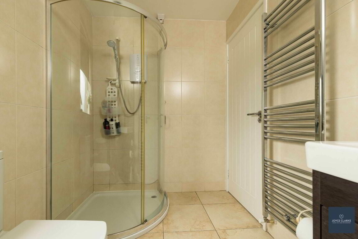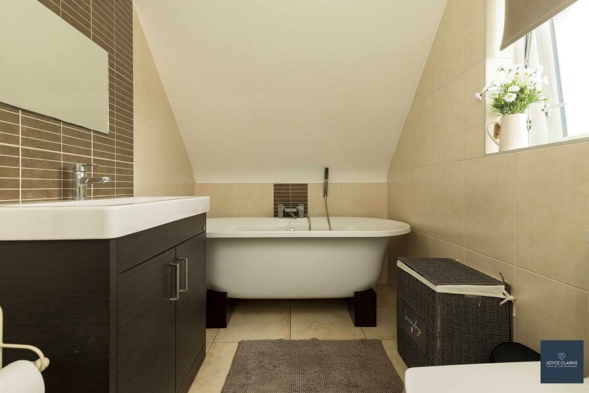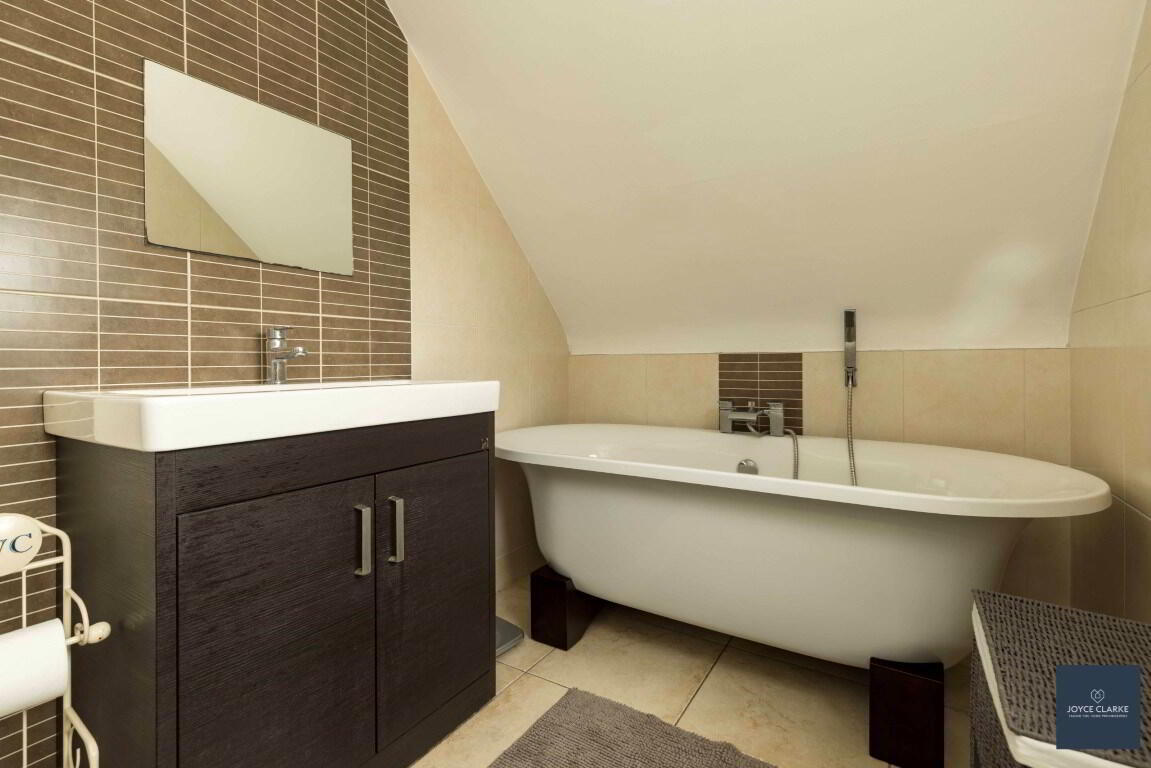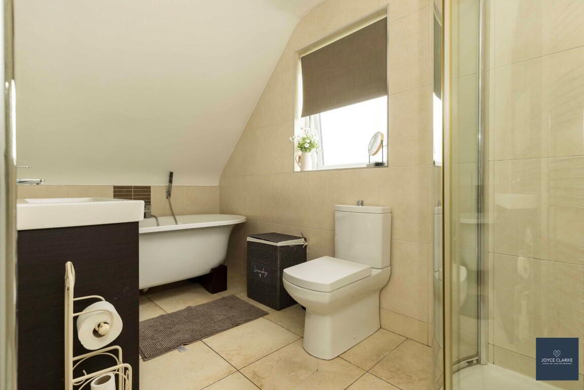 Excellent four piece bathroom suite comprising of freestanding bath with centre taps and shower head attachment, back to wall dual flush WC, oversized wash hand basin with vanity unit below and separate shower quadrant with electric shower. Heated towel rail. Fully tiled walls and flooring. Extractor fan.