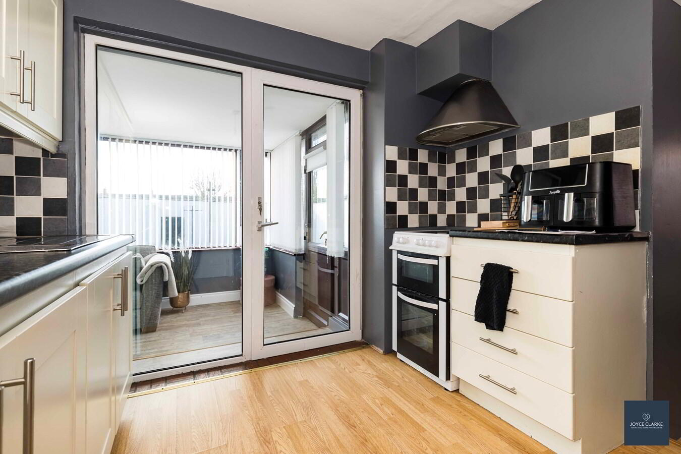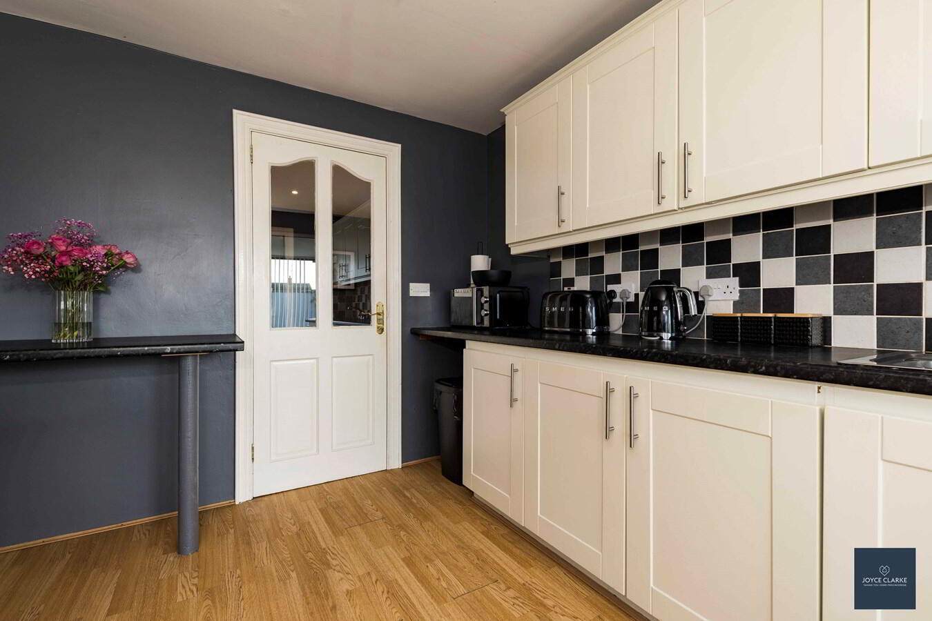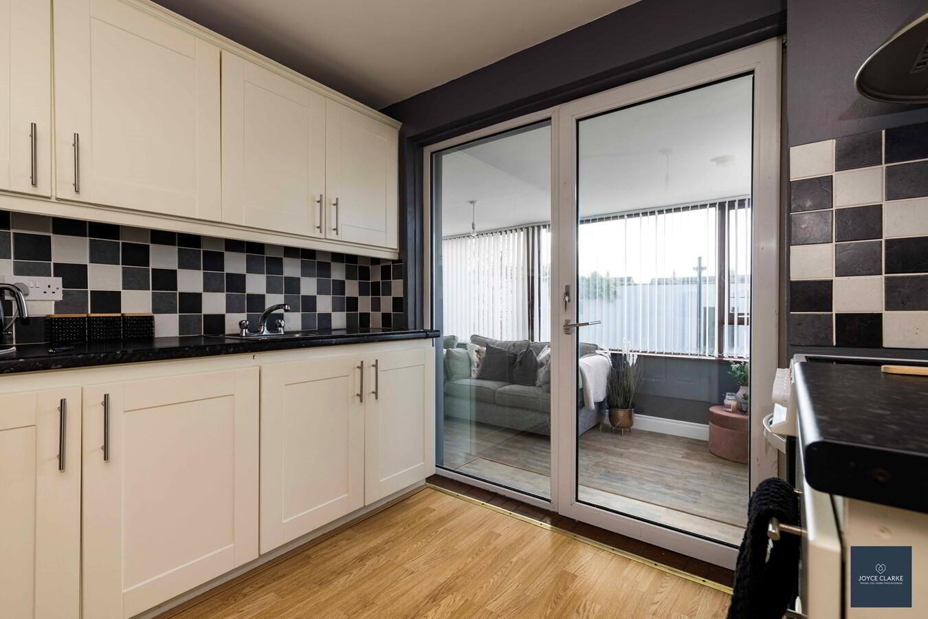 Range of high and low level storage units and breakfast bar. Stainless steel sink and drainer. Space for oven. Laminate flooring and tiled splashback. UPVC door to sunroom.
