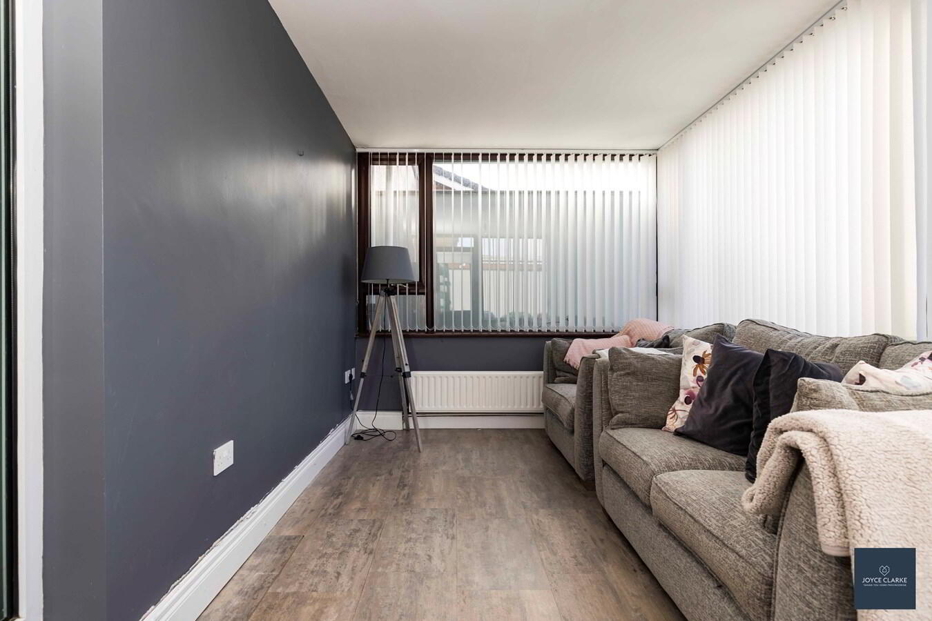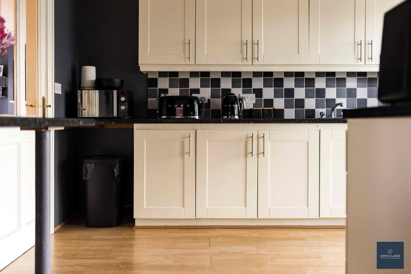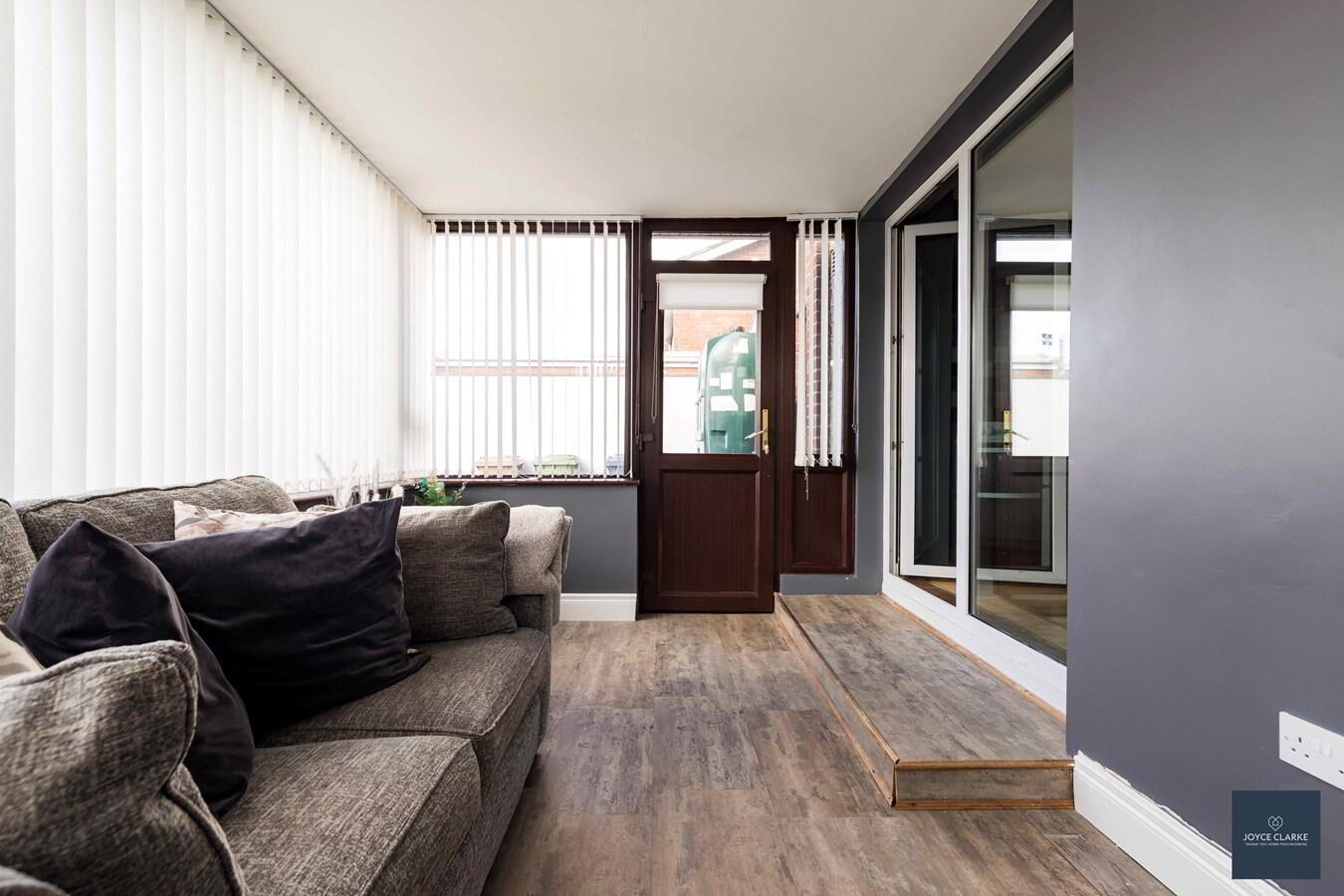 Range of high and low level storage units and breakfast bar. Stainless steel sink and drainer. Space for oven. Laminate flooring and tiled splashback. UPVC door to sunroom.