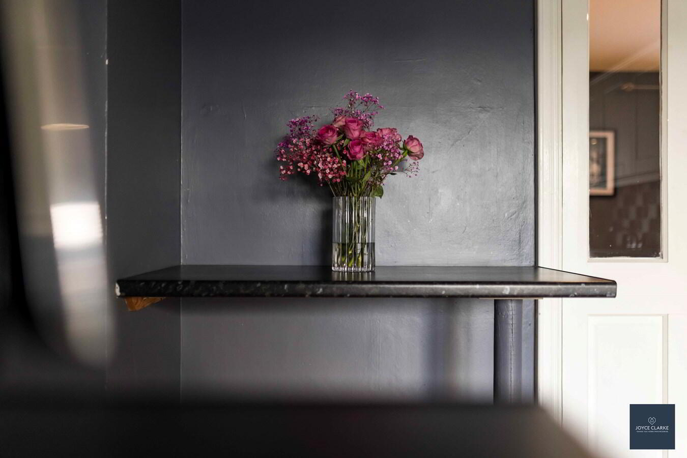 Feature fireplace with cast iron insert set up tiled hearth. Storage closet. Double panel radiator. Laminate flooring and recessed lighting.