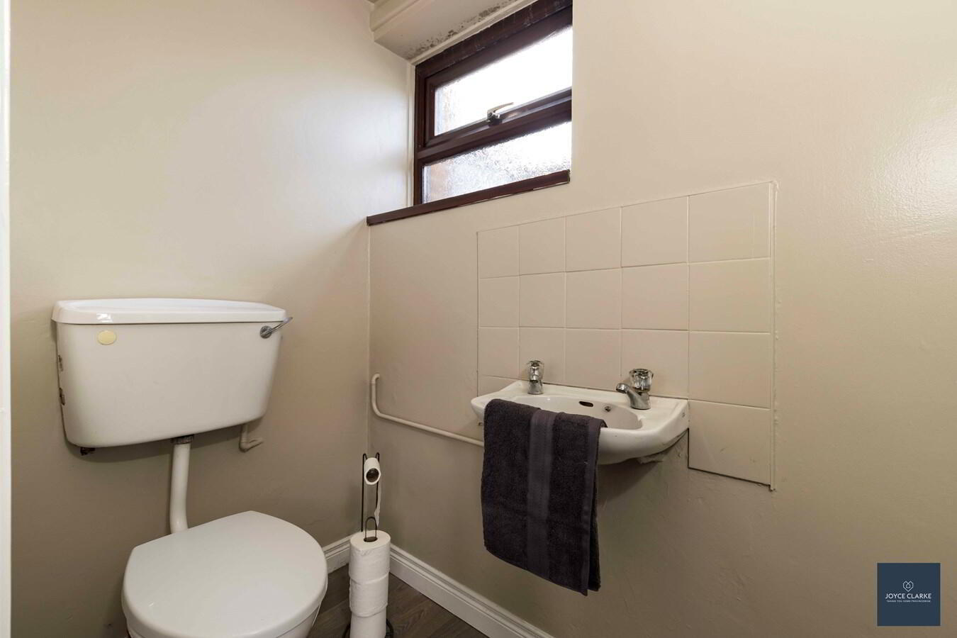 Shower enclosure with mains fed shower. Floating sink. WC. Laminated flooring. Tiled splashback. Window. Extractor.